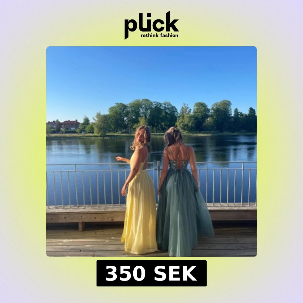 Superfin ljusgul långklänning med halterneck och öppen rygg. Klänningen har tunna axelband med små pärlor, flowigt fall och slits framtill. Perfekt för bal eller andra festligheter 🌟🎉 Jag är 168 cm lång, men har sytt upp klänningen i längden (går enkelt att förlänga igen) skriv gärna om du har fler frågor om mått eller liknande!