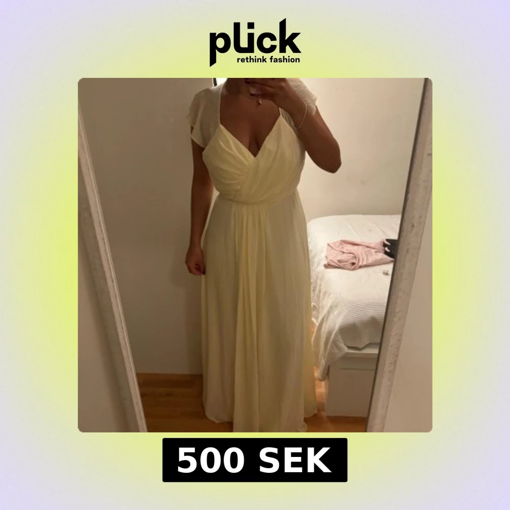 Superfin ljusgul långklänning med omlott framtill, v-ringning och volangdetaljer på axlarna. Klänningen har öppen rygg med knytband och faller snyggt längs kroppen. Perfekt för sommarens speciella tillfällen! Bra skick, använt en gång på ett bröllop, säljer för att den är för stor samt att jag inte kommer använda den mer.