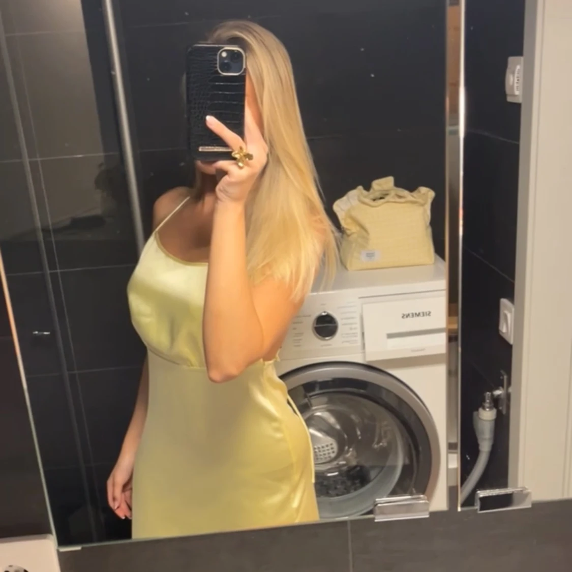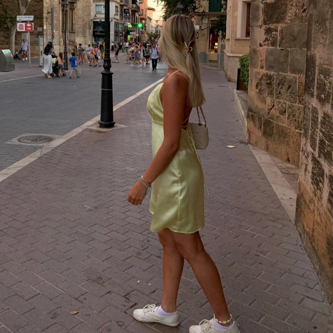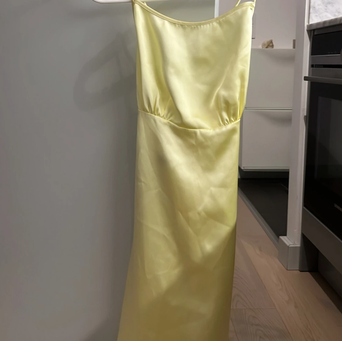 Superfin ljusgul satinklänning med tunna axelband och snygg öppen rygg med snörning. Klänningen är från Mathilde Gohler x NA-KD. Axelbanden går att justera 🩷