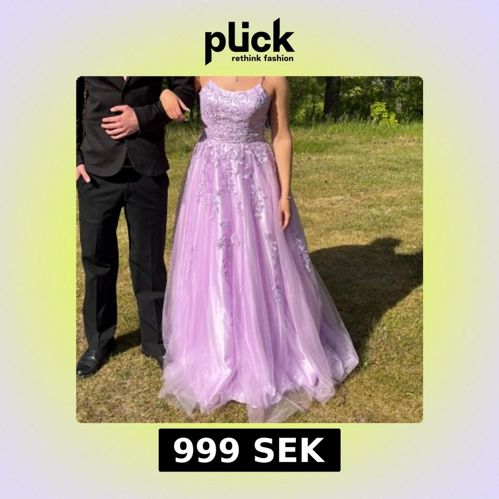 Drömmig ljuslila långklänning med tunna axelband, vacker snörning i ryggen och broderade blommor över hela klänningen. Kjolen är i flera lager tyll som ger en riktigt prinsessig känsla. Perfekt till balen. Den har ett litet kort släp som lägger sig fint på marken när man går☺️☺️ Den passar många olika storlekar eftersom det är snörning i ryggen så den passar många🤗