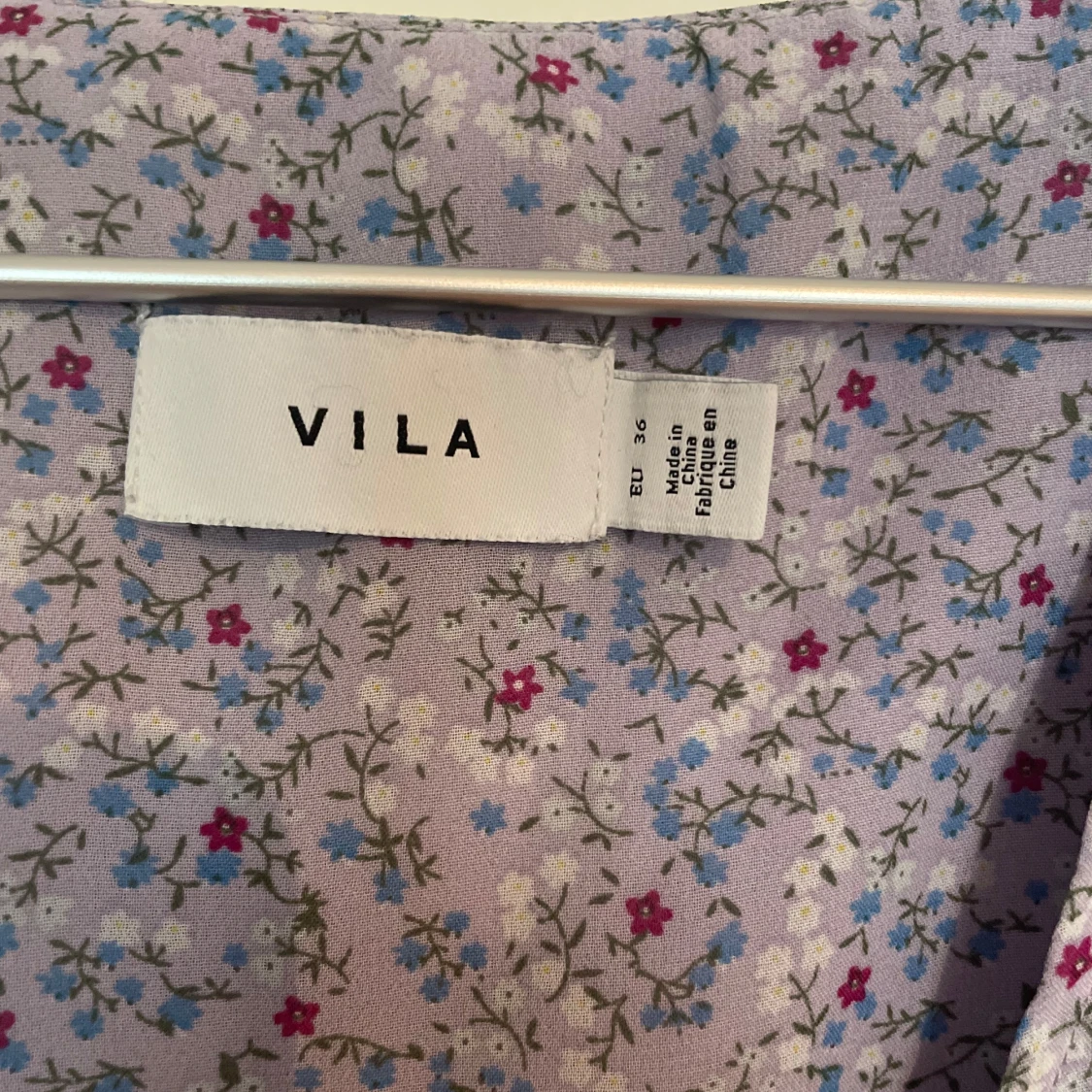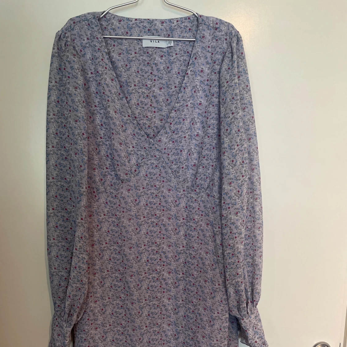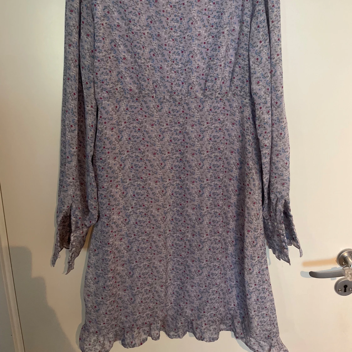 Supersöt ljuslila kortklänning från Vila med småblommigt mönster. Klänningen har v-ringning, långa ärmar med volangdetalj vid ärmslut och volangkant nertill. Perfekt för sommarens alla tillfällen!