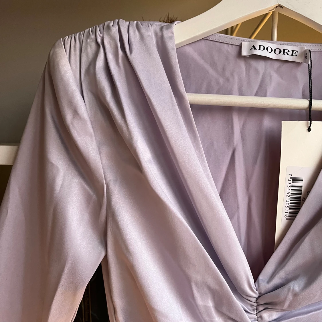 Supersnygg långklänning i ljuslila från Adoore med v-ringning, rynkdetalj framtill och långa utsvängda ärmar. Aldrig använd då den blivit för liten, lappar sitter kvar! 💖stl 32