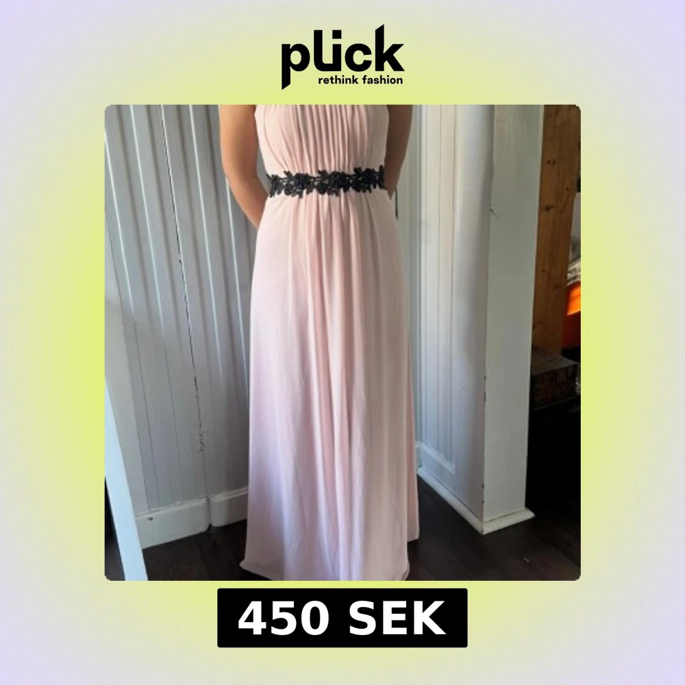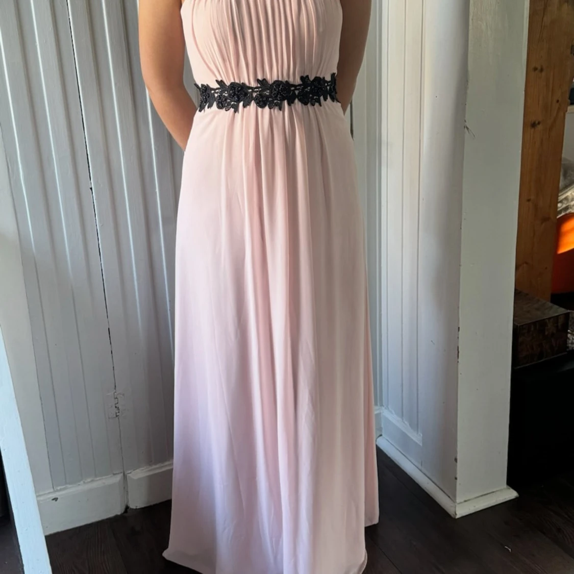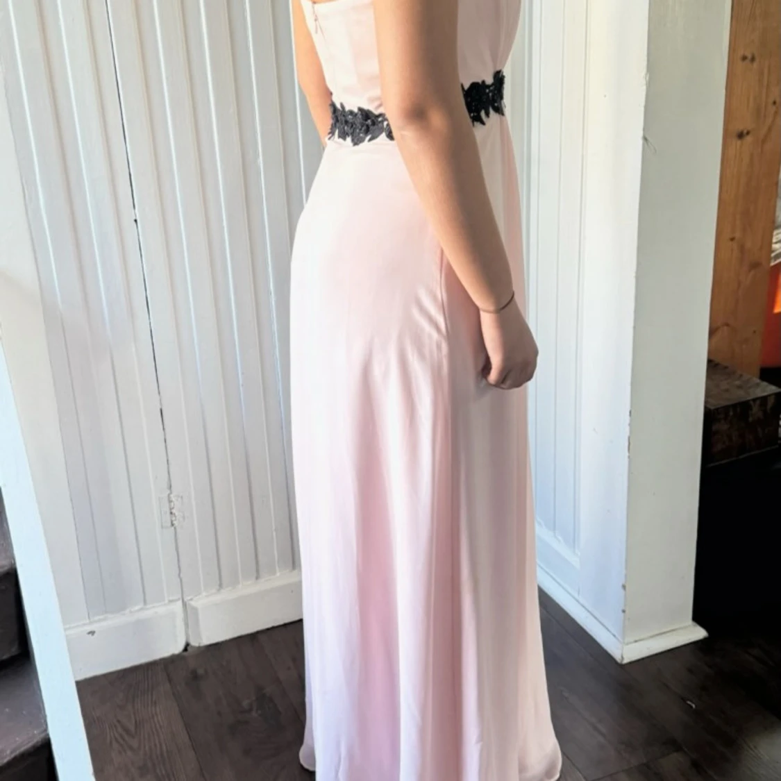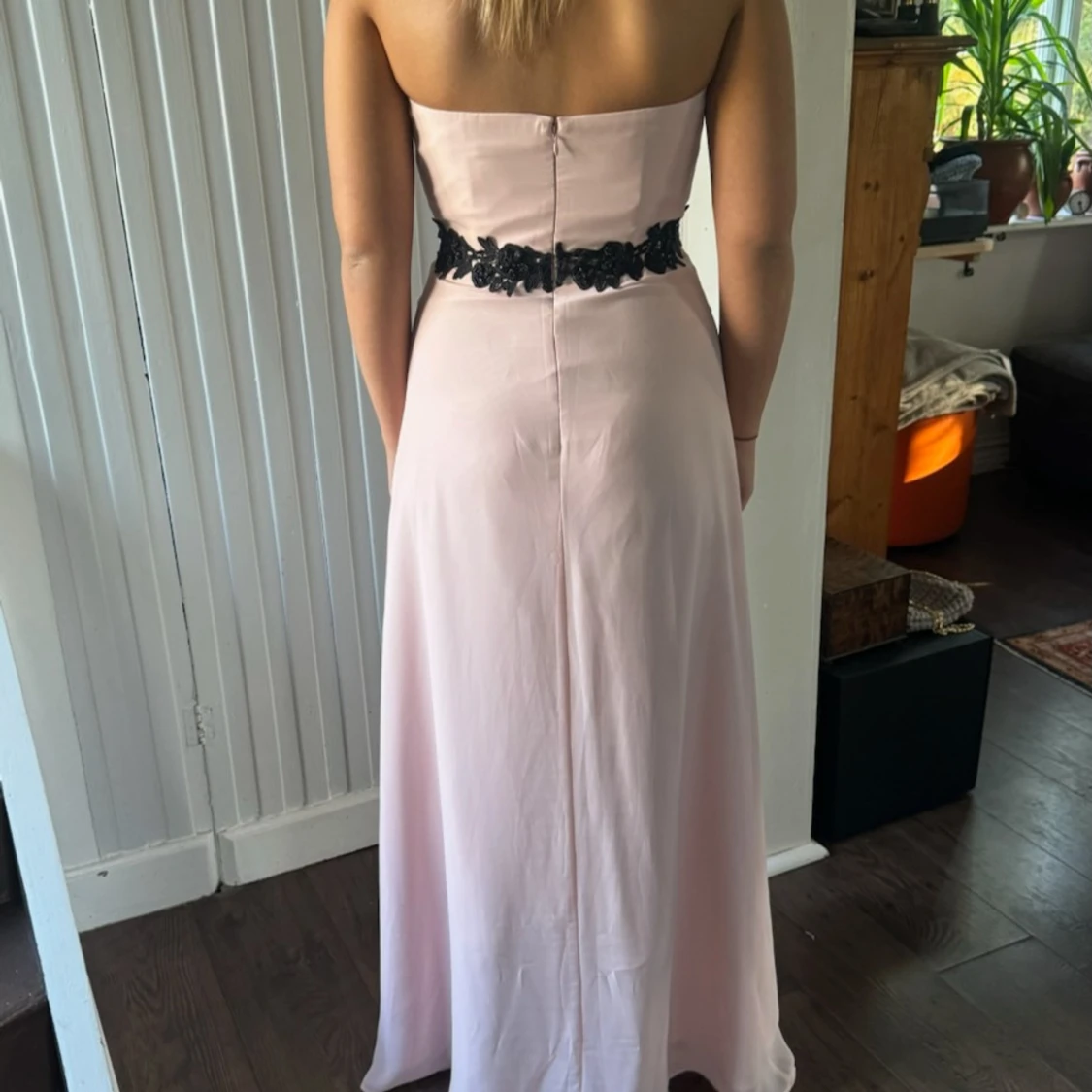 Elegant ljusrosa långklänning med axelbandslös design och svart spetsdekor i midjan. Klänningen har ett mjukt, fallande tyg och en romantisk känsla, perfekt för speciella tillfällen. Skickar snabbt!