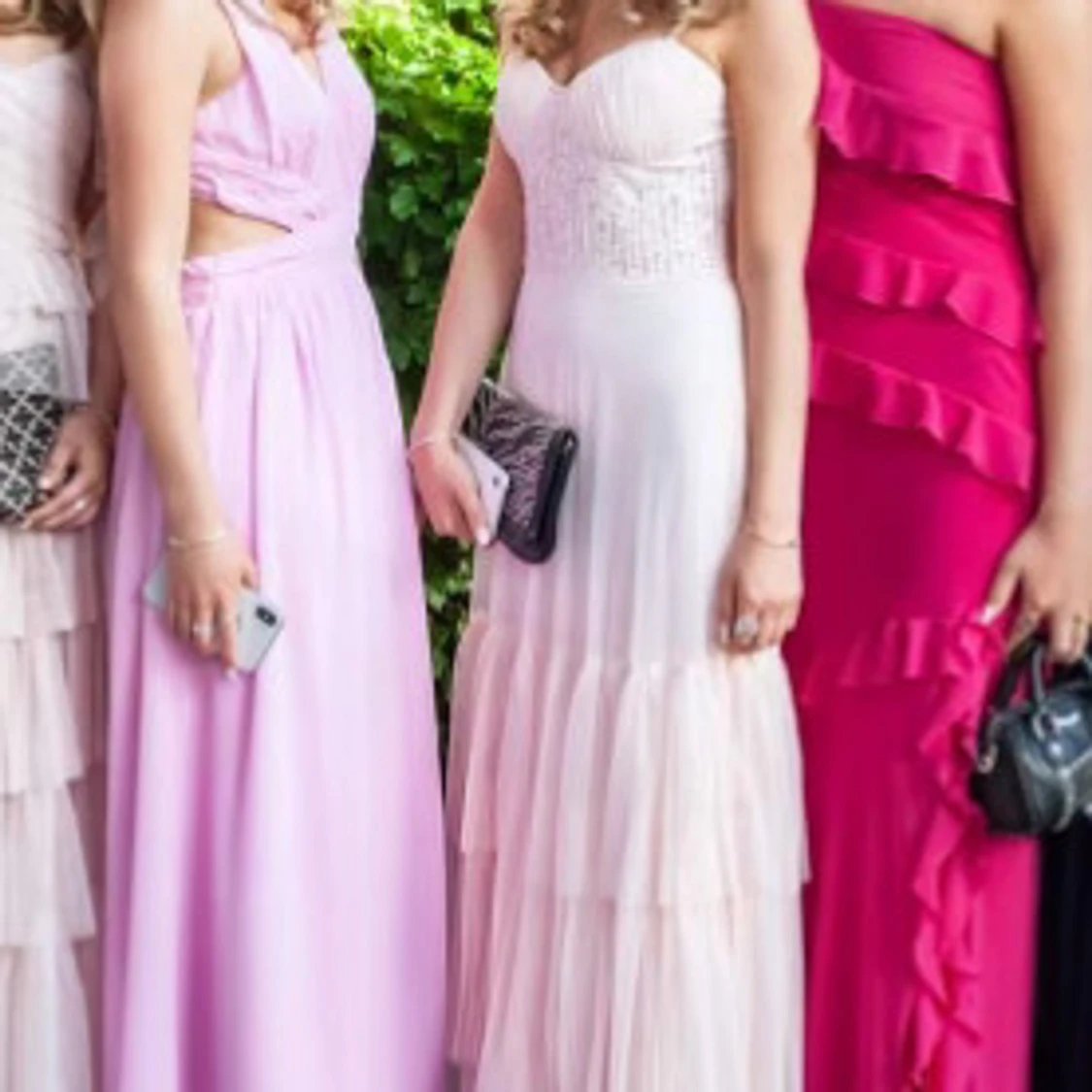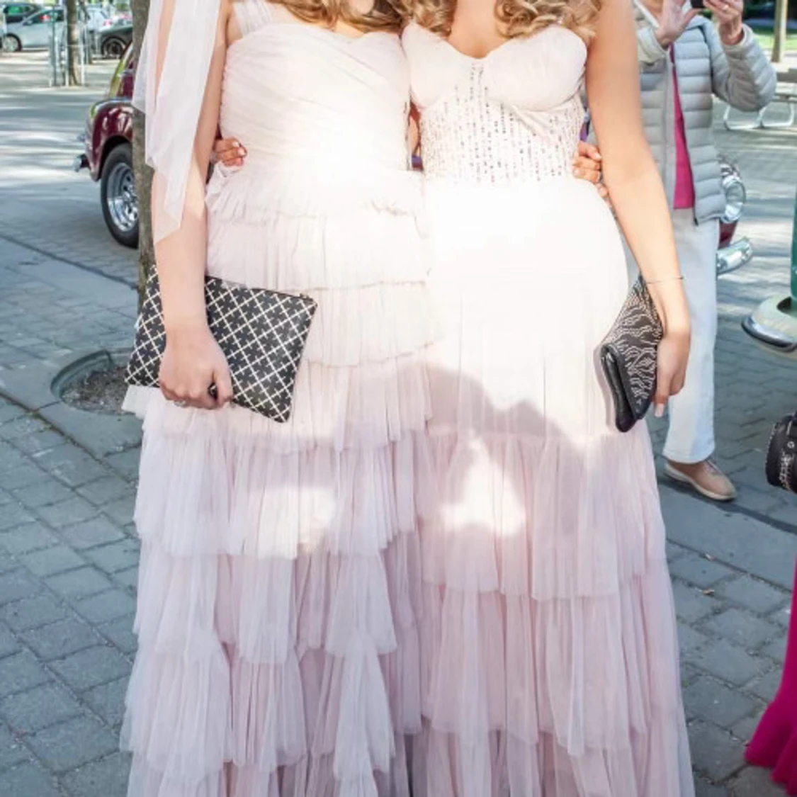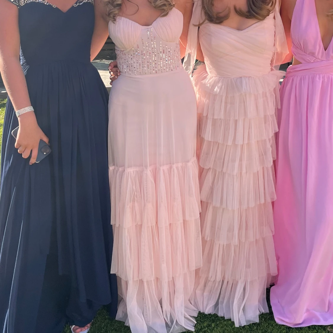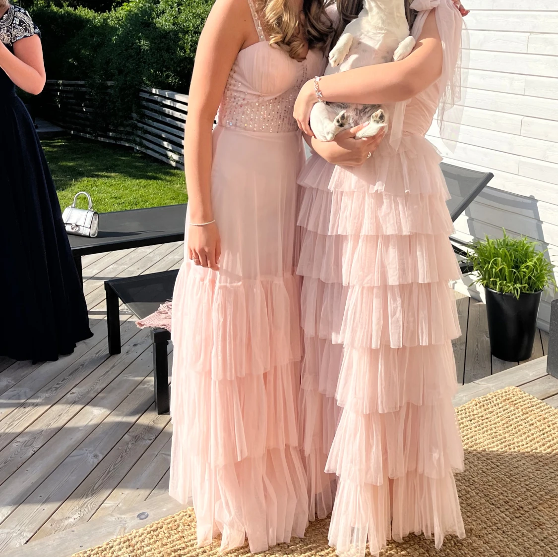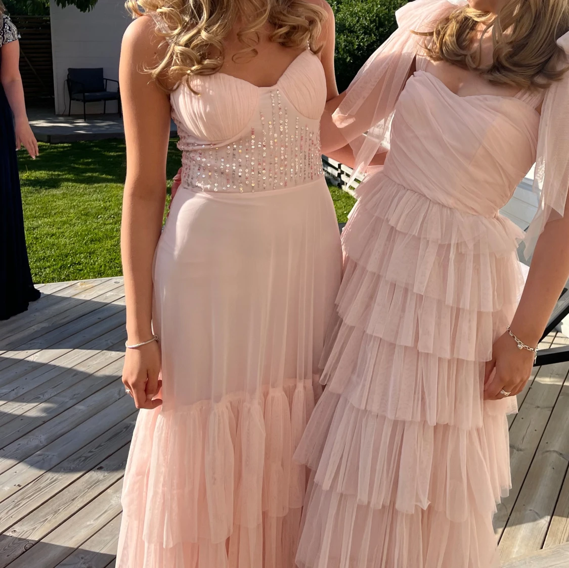 ⚠️RESERVERAD⚠️Elegant ljusrosa balklänning med volanger och pärldetaljer på överdelen. Klänningen är bra i längden på mig som är 165 och har klackar som är ca 5-7 cm höga. Såå vacker och får en verkligen att sticka ut på balen! Går ej att köpa längre så du kan vara säker på att ingen kommer ha en likadan😉 Köptes för 1500 men säljer för 950, endast använd en gång!❤️