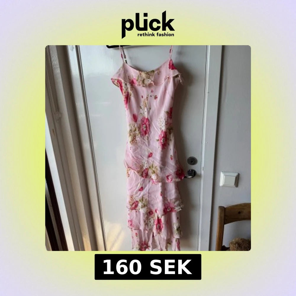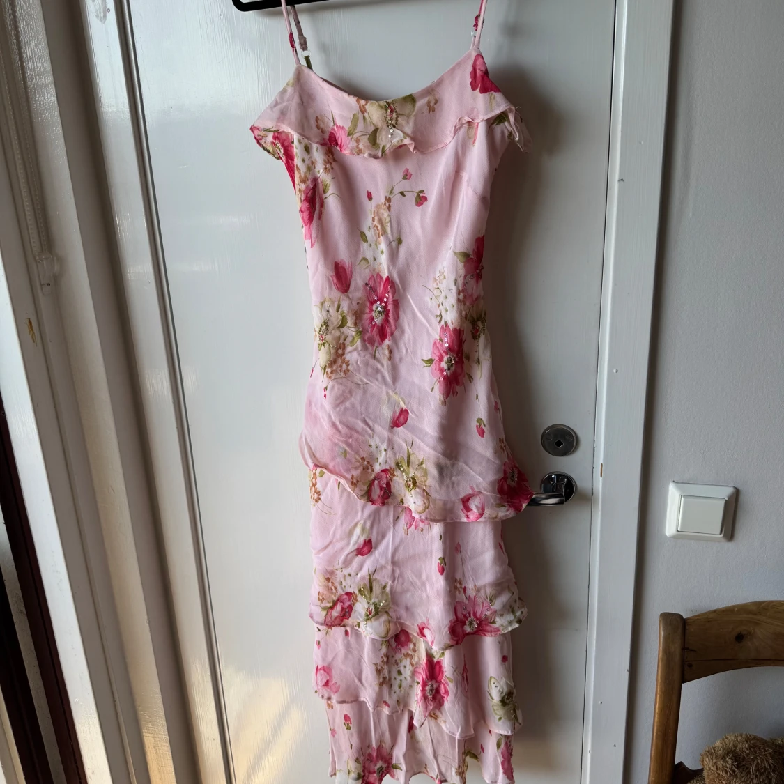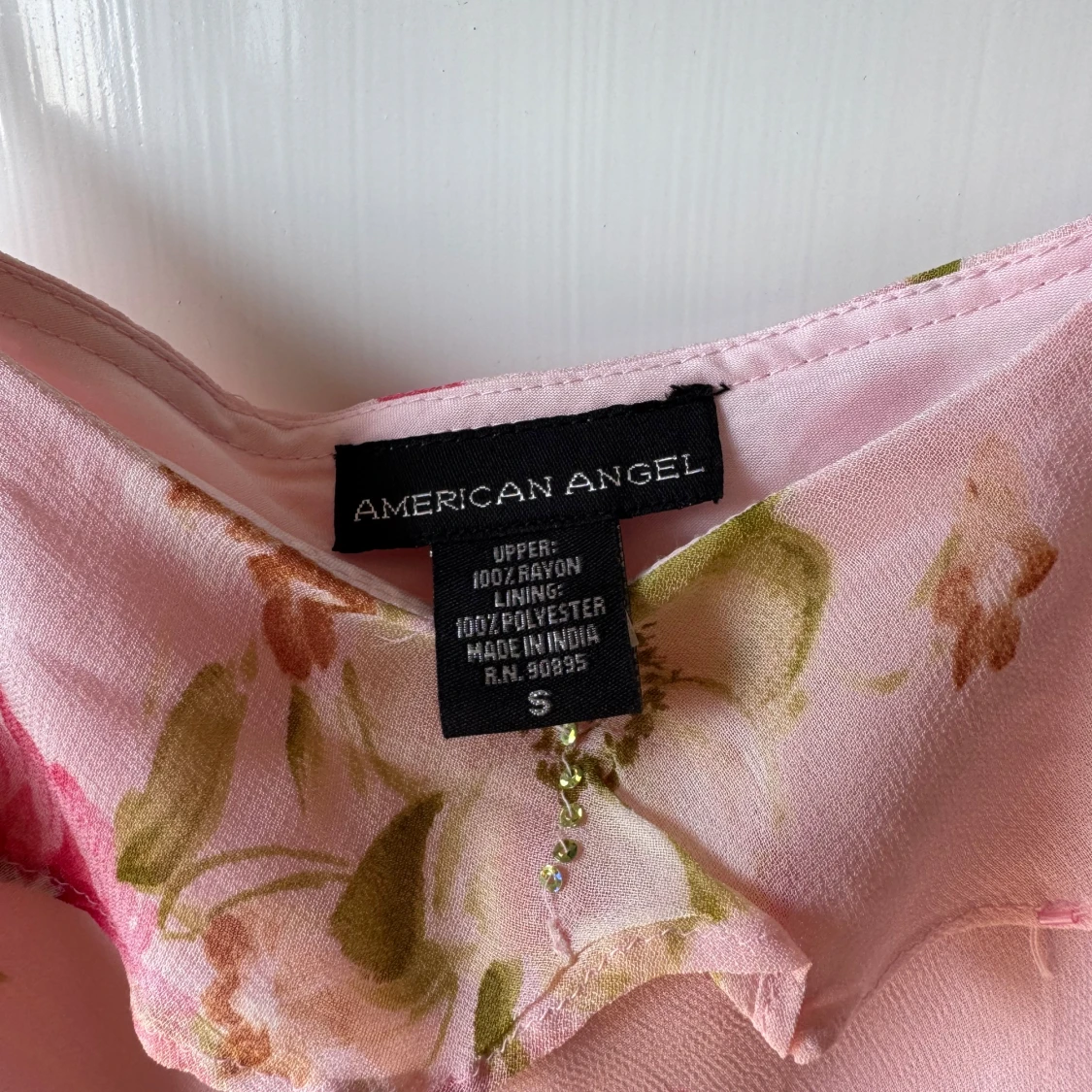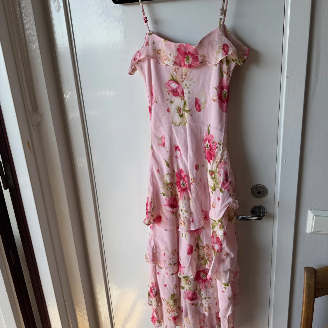 Superfin ljusrosa långklänning från American Angel med blommigt mönster i rosa och beige toner. Klänningen har smala axelband, volangdetaljer och flera lager i kjolen. Materialet är rayon med polyesterfoder, perfekt för sommarens alla tillfällen.