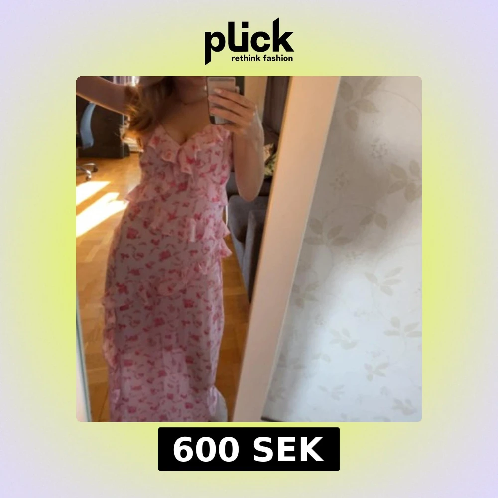 Superfin långklänning i ljusrosa med små rosa blommor, volangdetaljer framtill och längs kjolen. Klänningen är köpt från Veromoda och endast använd en gång en kort stund på min skolavslutning så det är i ny skick💗
