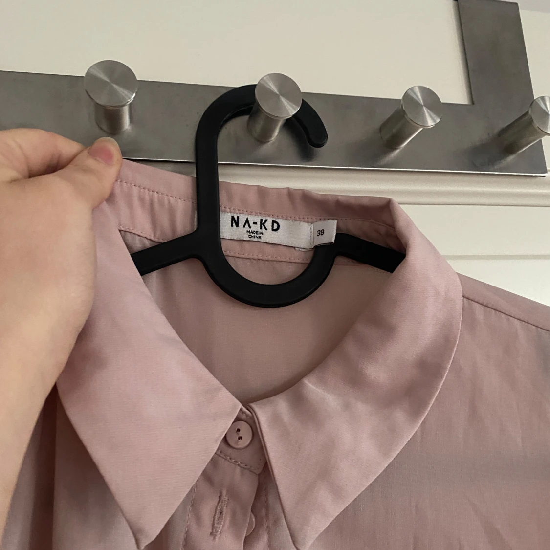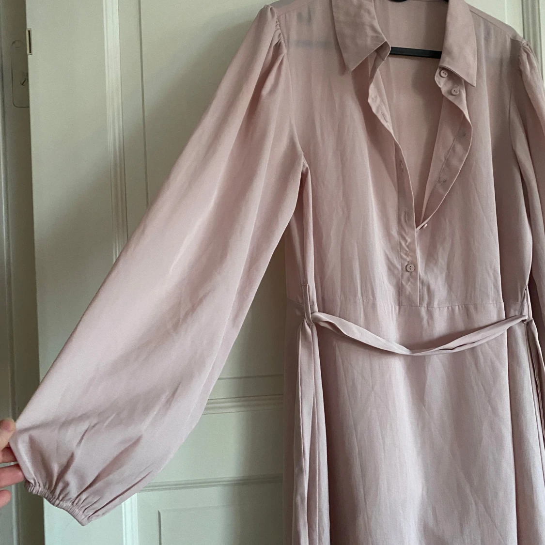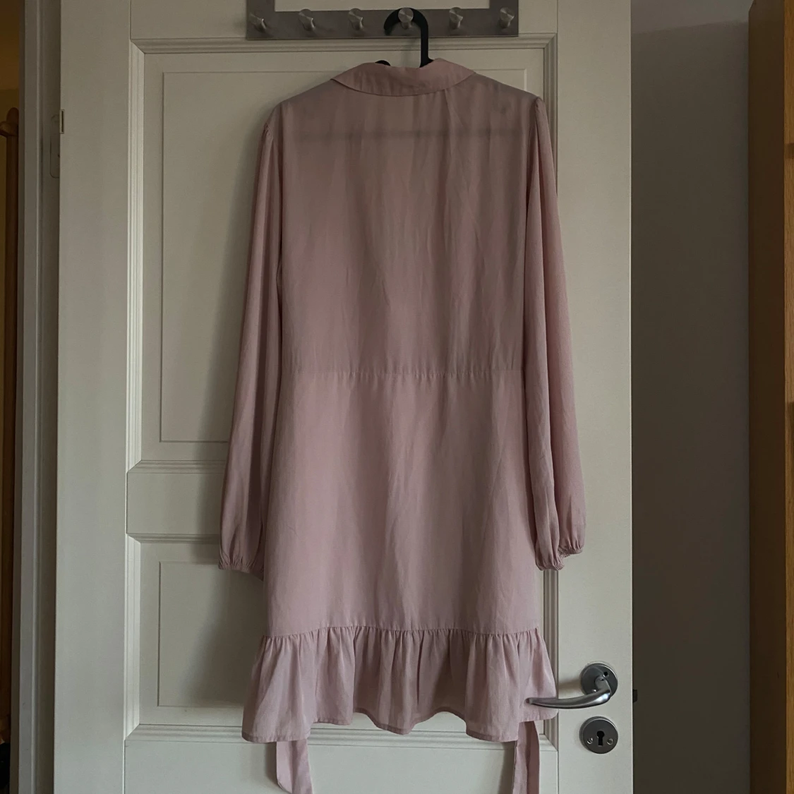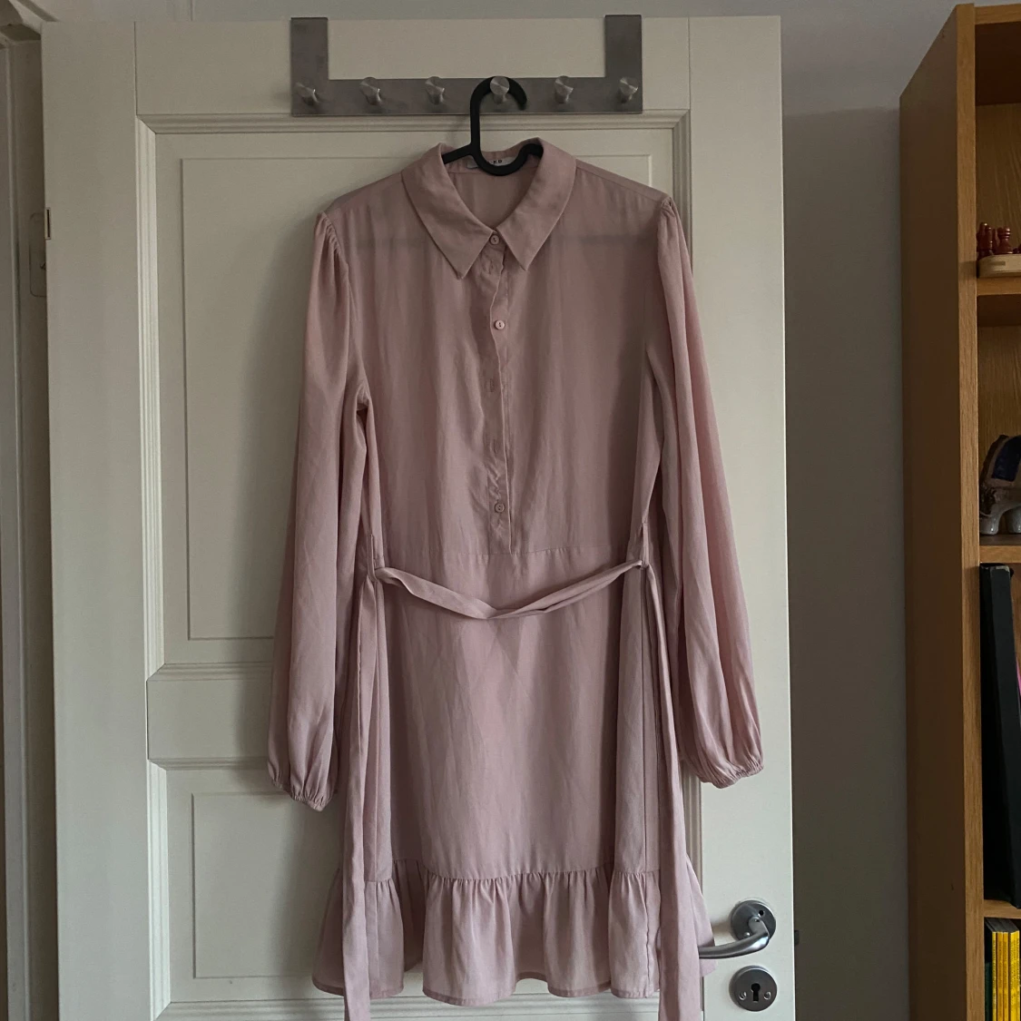Säljer en söt ljusrosa klänning från NA-KD med långa ärmar och knappar framtill. Klänningen har en volangdetalj vid fållen och ett knytband i midjan för en fin passform. Perfekt för vårens och sommarens tillfällen! 🌸