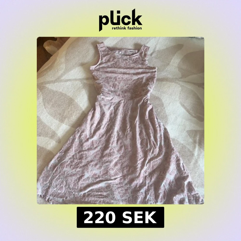 Superfin ljusrosa klänning med blommigt mönster i sammet och en söt rosett i ryggen. Klänningen är ärmlös och har en rund halsringning. Materialet är mjukt och har en lyxig känsla med vacker struktur. Passar perfekt när du vill känna dig extra fin.