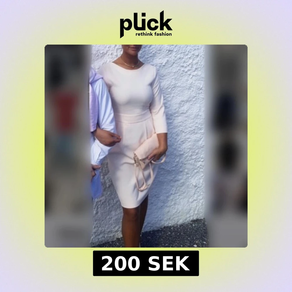 En stilren ljusrosa knälång klännin( med trekvartsärm och markerad midja. Klänningen har rund halsringning och en snygg guldfärgad dragkedja i ryggen. Använd på bröllop en gång ( se bild ). Storlek M, men sitter bra på en S också.