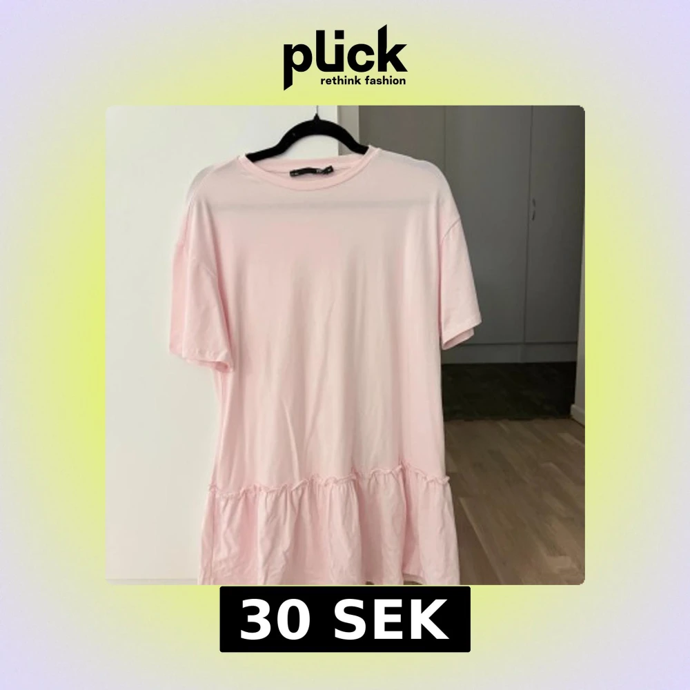 Söt ljusrosa klänning från 157 i storlek M. Modellen är kort med rund halsringning, korta ärmar och en volangdetalj nedtill. Endast testad