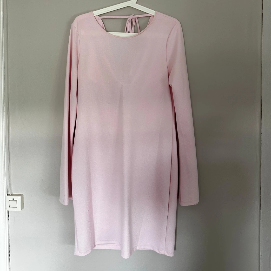 Säljer en ljusrosa klänning med lång ärm och snygg draperad rygg. Klänningen har en kort längd och knytning i nacken som ger en extra detalj. Materialet känns mjukt och har ett fint fall. Perfekt för dig som gillar stilrena och feminina plagg.
