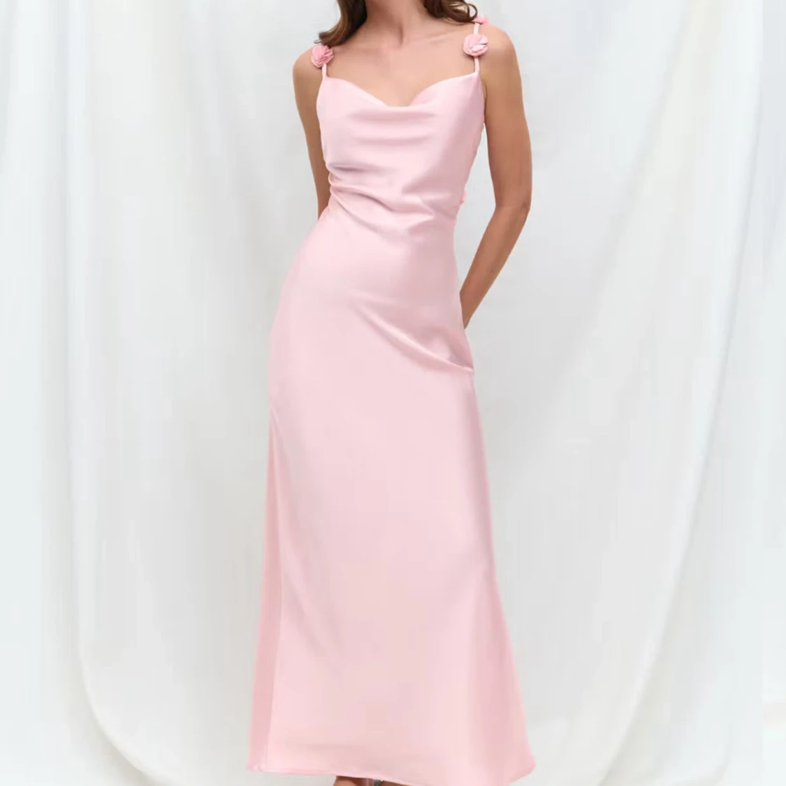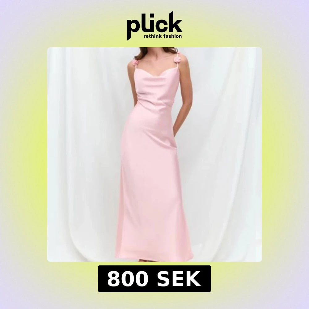 Säljer en elegant ljusrosa långklänning med smala axelband och söt detalj vid axlarna. Klänningen har en figurnära passform och är tillverkad i ett slätt, glansigt material som ger en lyxig känsla. SLUTSÅLD