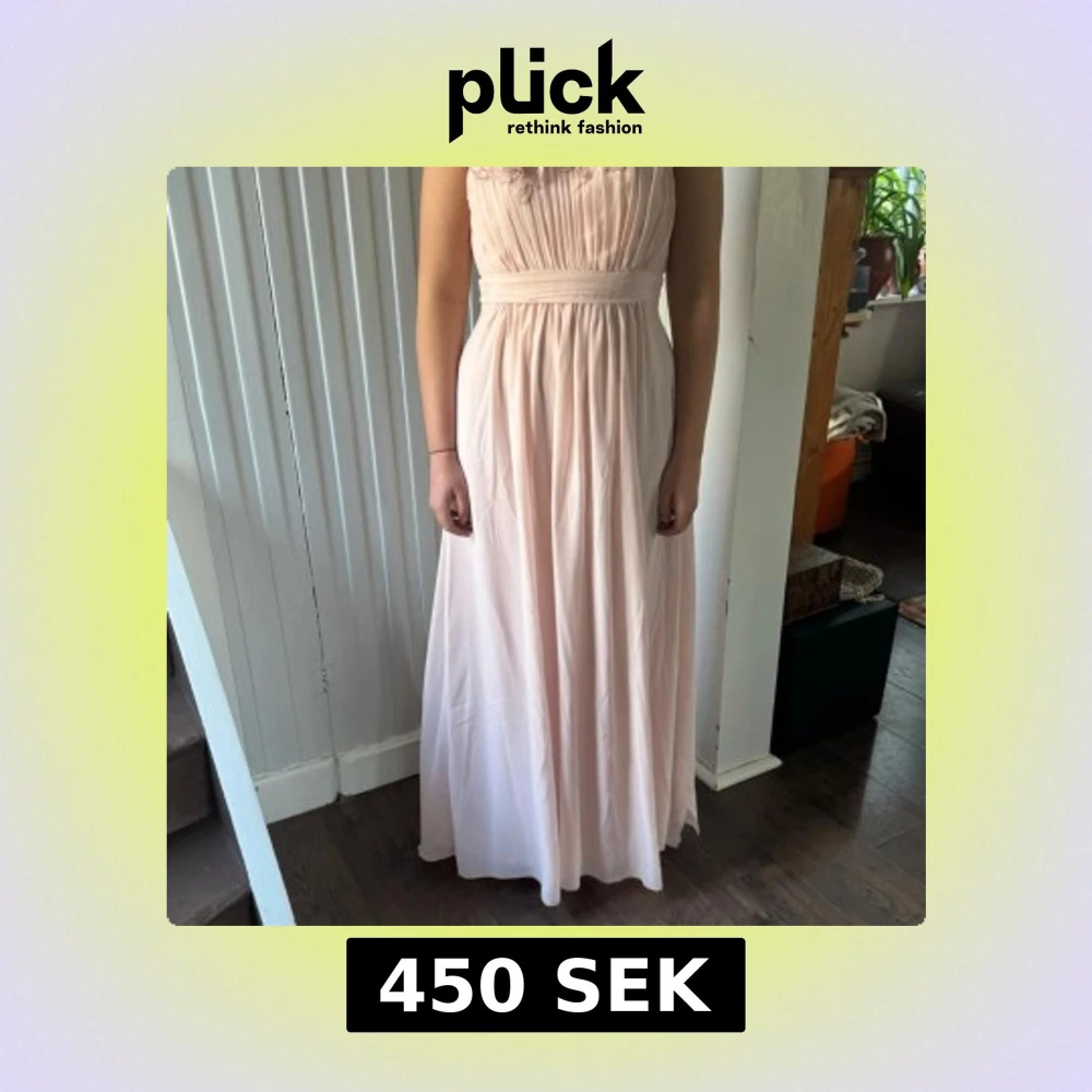 Säljer en elegant ljusrosa långklänning med plisserad överdel och markerad midja. Klänningen har ärmlös design och dragkedja i ryggen. Perfekt för bal eller festliga tillfällen. Axelbanden går att ta av. Skickar snabbt!