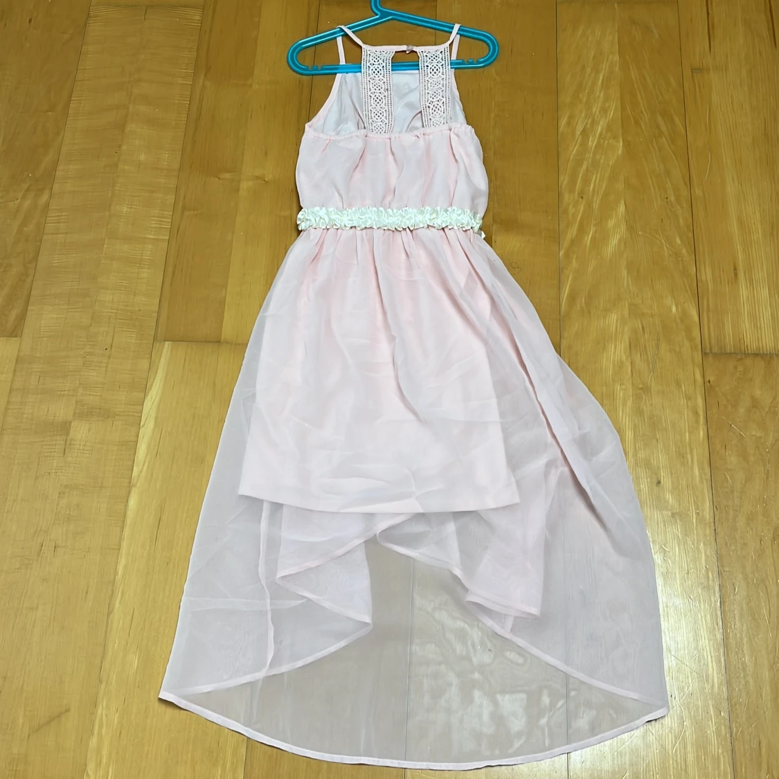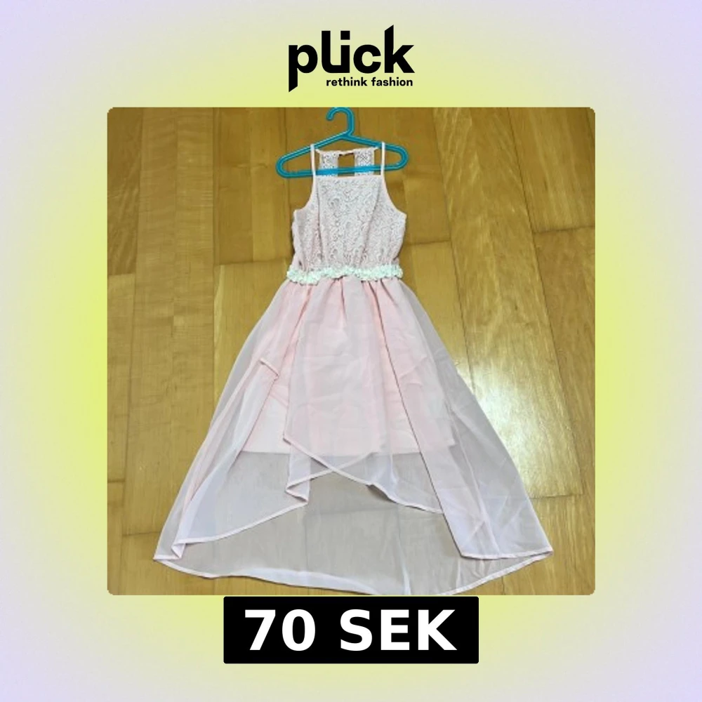 Superfin ljusrosa långklänning med spets upptill och smala axelband. Midjan är dekorerad med blommiga detaljer och kjolen har lager på lager i tunn, flowy polyester. Perfekt för dig som vill ha en romantisk och söt look med extra volym i kjolen.