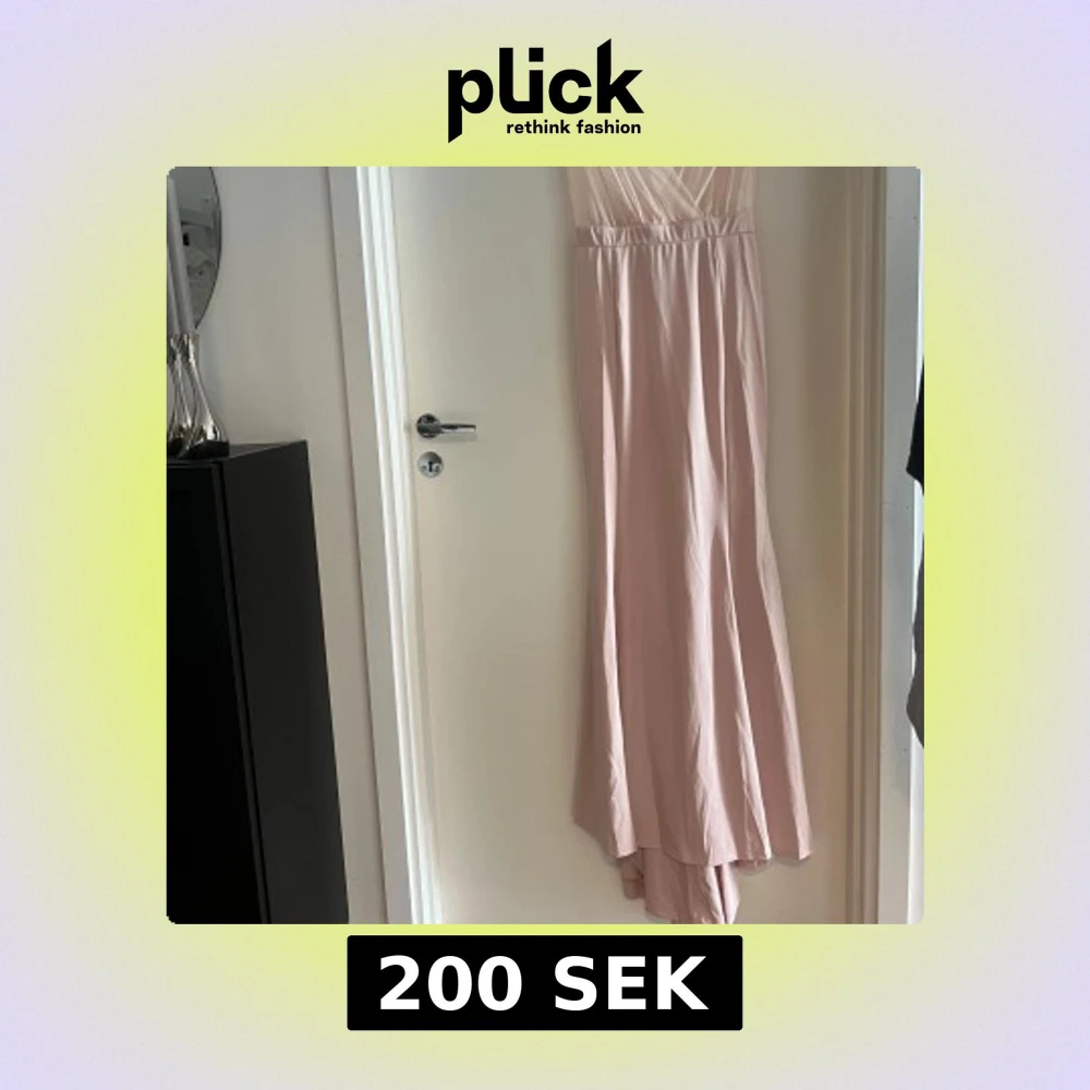 Elegant ljusrosa långklänning med djup v-ringning och tunna axelband. Överdelen är i ett skirt, glittrigt tyg. Kjolen är slät och faller snyggt längs kroppen. Funkar för S och M