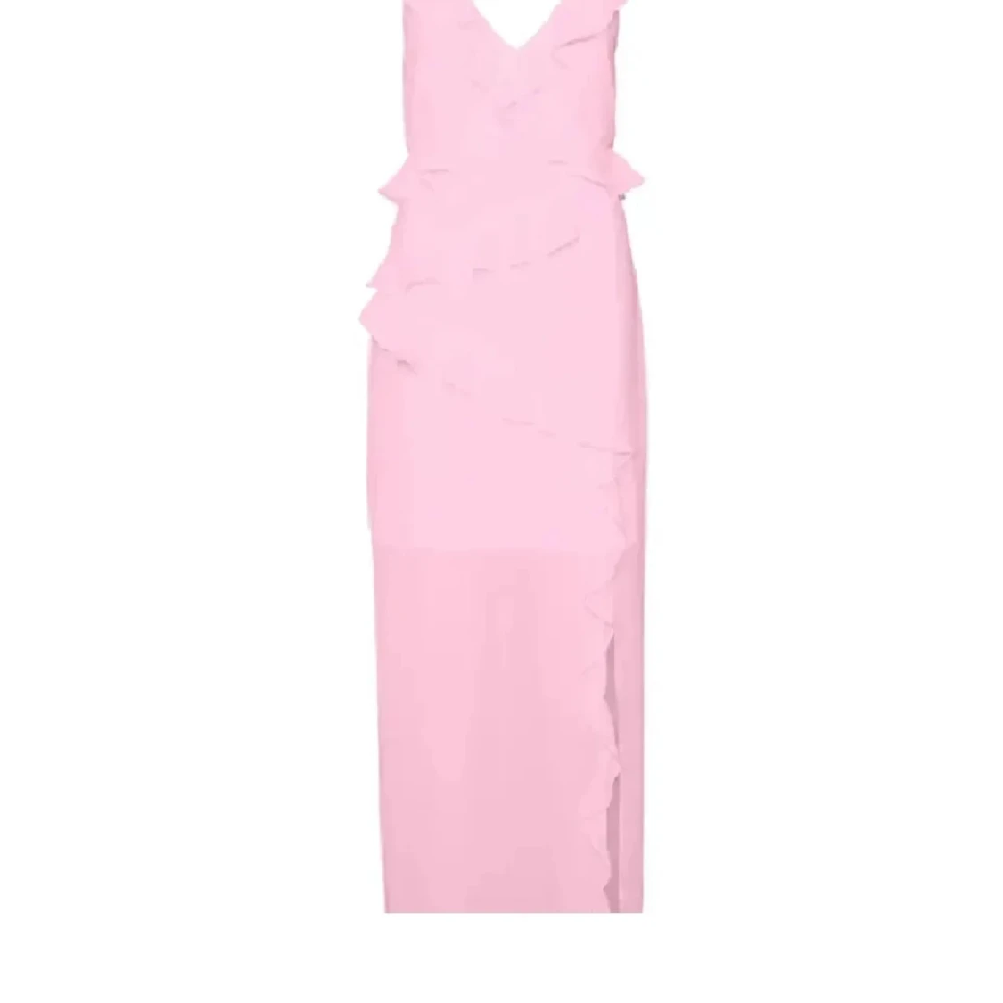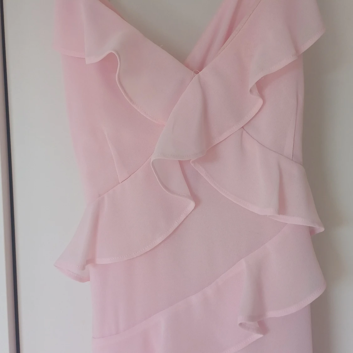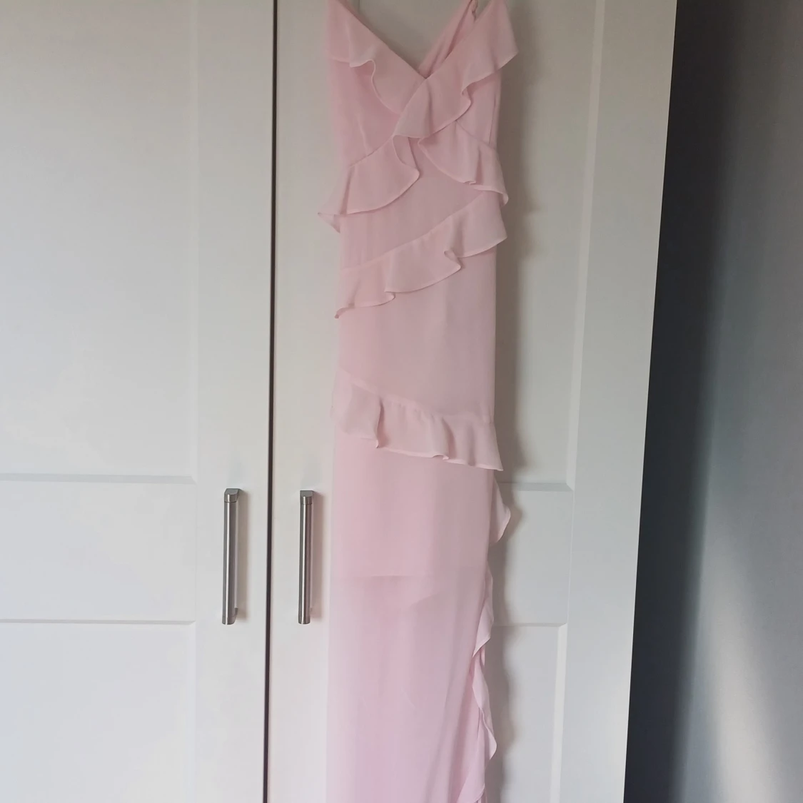 FINNS ÄVEN PÅ MIN VINTED skriv vid intresse Säljer en superfin ljusrosa långklänning med v-ringad hals och tunna axelband. Klänningen har flera lager med volanger framtill som ger en romantisk och flowy känsla. Materialet är lätt och känns luftigt, perfekt för varmare dagar eller speciella tillfällen.