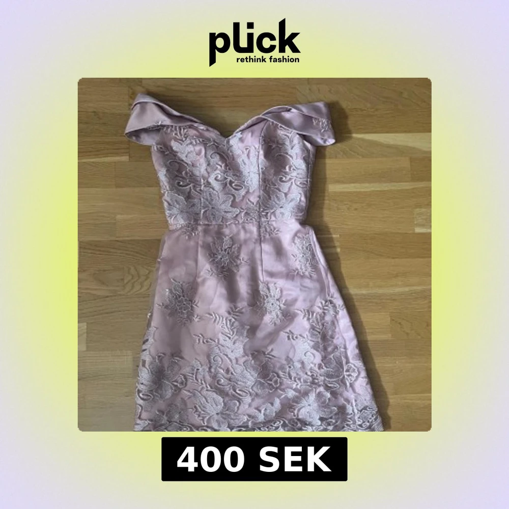 Supersöt ljusrosa kortklänning från Chi Chi London med offshoulder och v-ringad hals. Klänningen har vackra blommiga spetsdetaljer och är gjord i glansigt satinliknande material. En axelrem har lossnat men kan lätt åtgärdas.