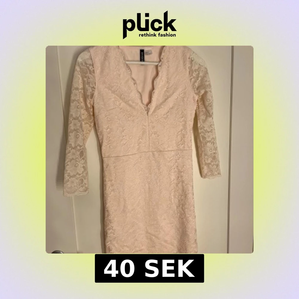 Säljer en söt ljusrosa klänning från hm med v-ringning och trekvartsärmar. Klänningen är täckt av vacker spets och har en figurnära passform. Perfekt för vårens och sommarens fester! 🌸