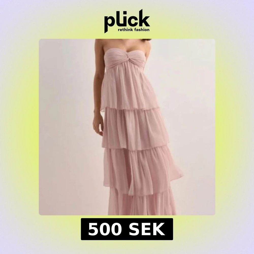 Superfin ljusrosa långklänning med flera lager volanger och bandeau-topp. Klänningen har en romantisk känsla med sitt luftiga chiffongtyg och kan bäras både axelbandslös eller med halterneck. Perfekt för dig som vill ha en flowy och feminin look. Helt oanvänd, provat en gång och kom fram till att det inte är min färg. Säljer den här pga av att jag missade retur tiden hos Nelly och kunde därför inte skicka tillbaks den. 700kr nypris