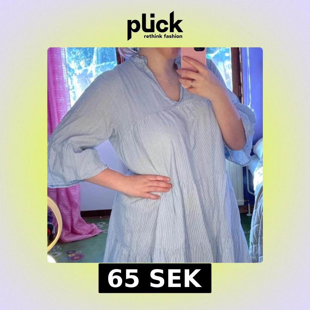 Säljer en luftig och bekväm blå och vit randig klänning med v-ringning och trekvartsärmar. Perfekt för en avslappnad stil. Klänningen har en lös passform och volangdetaljer som ger en fin rörelse. storlek L/XL! Luftig! Perfekt till sommaren! Använd några gånger