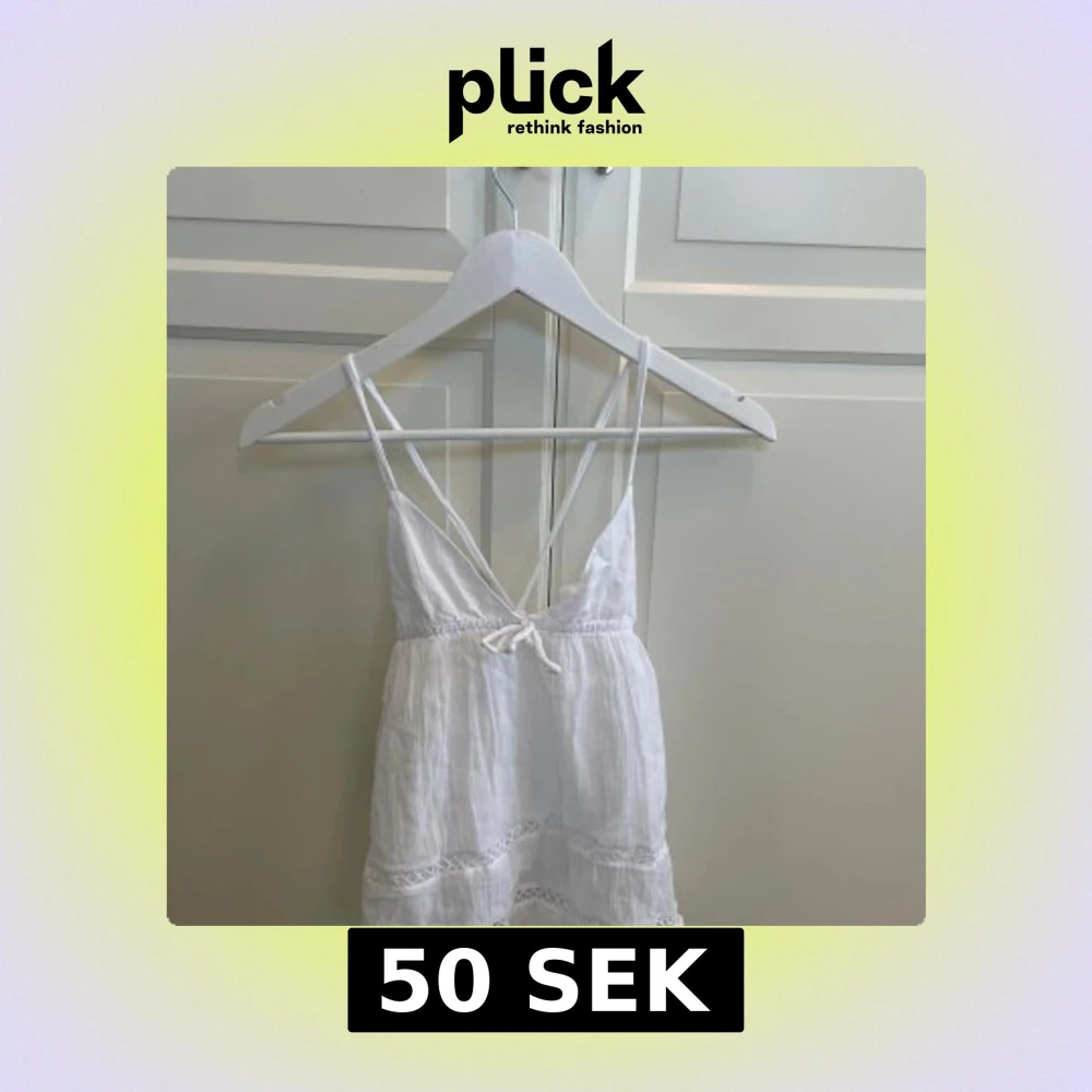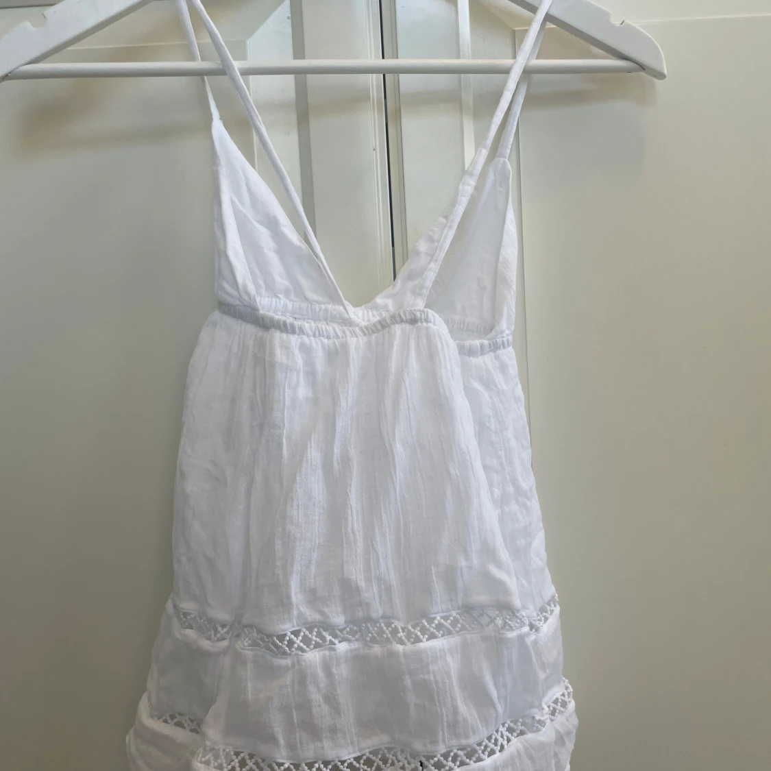 Supersöt vit topp från Gina Tricot med tunna axelband, v-ringning och knyt bak. perfekt för varma dagar. Enkel och fräsch stil som passar till sommaren. Aldrig använt