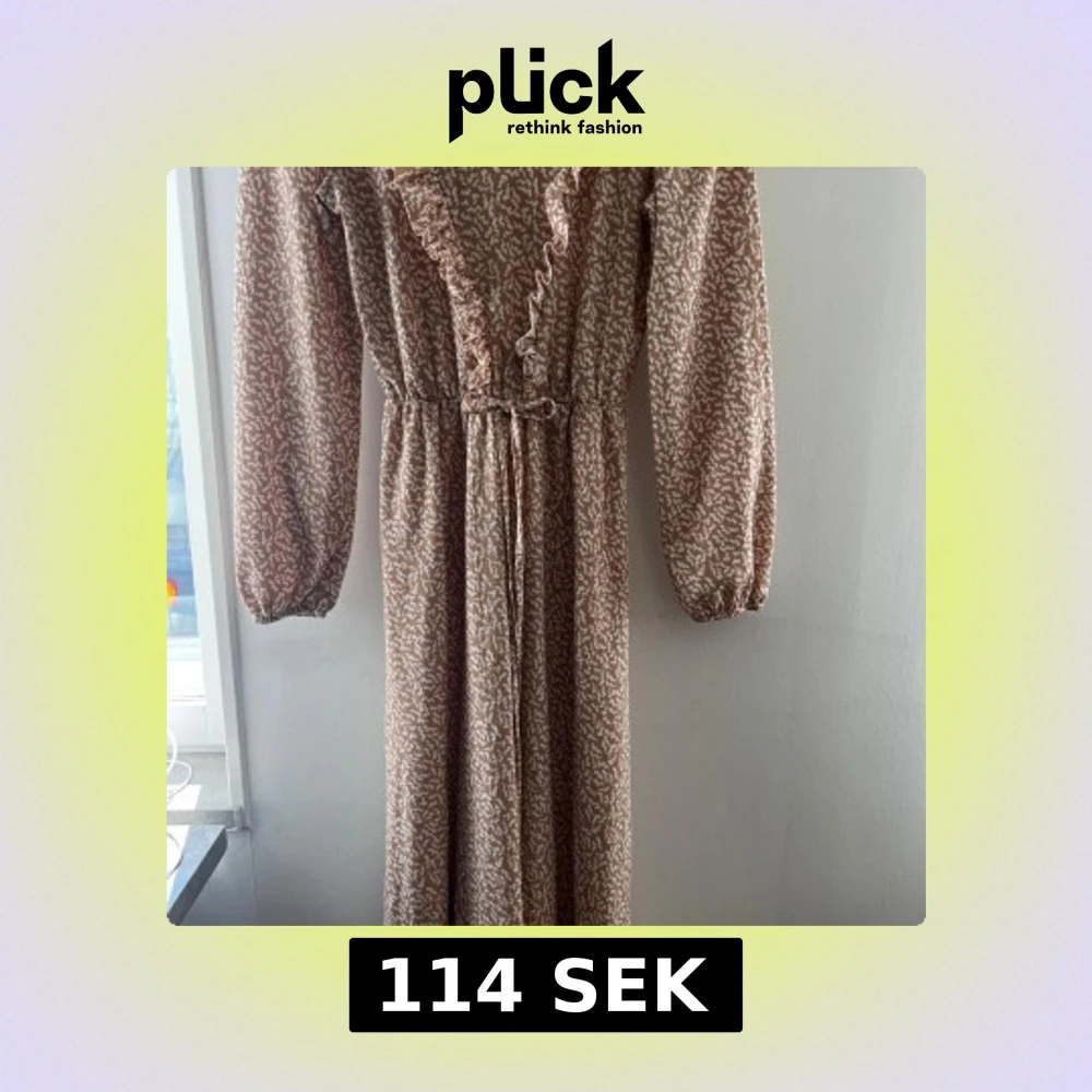 Långklänning i beige och vitt med abstrakt mönster. Klänningen har långa ärmar, volangdetaljer längs ringningen och knyt i midjan. Klänningen är från Modanisa. Någon söm har gått upp vid handleden på högersida. Men det är inte som påverkar funktionen och kan lagas med två stygn