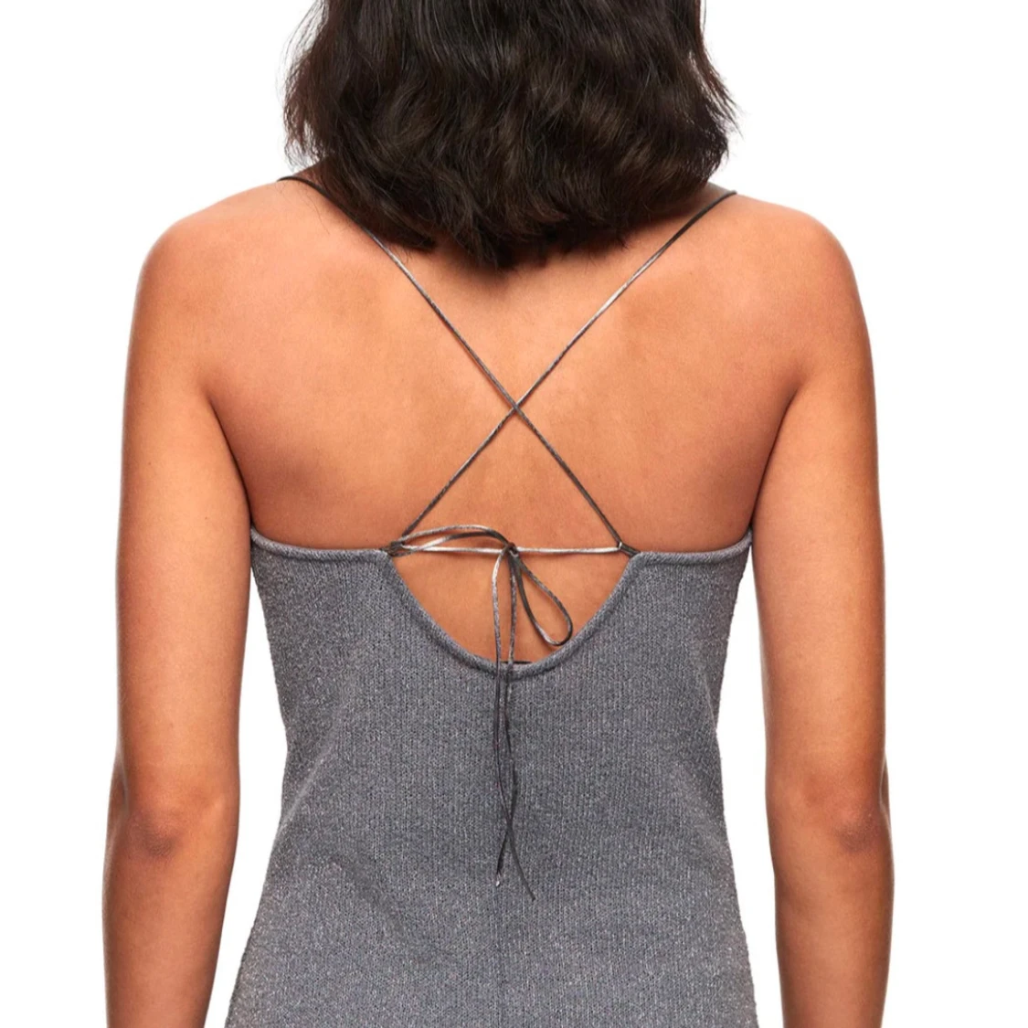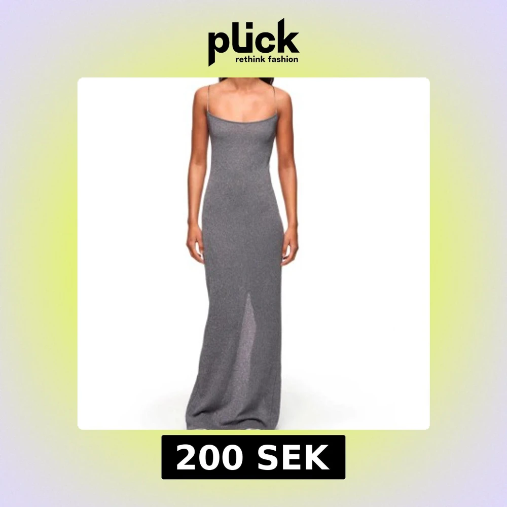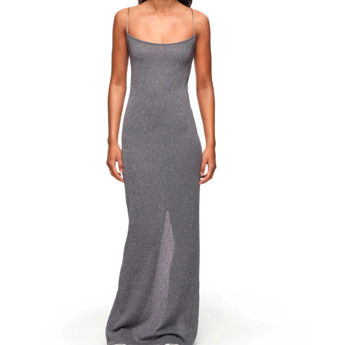 Glittrig långklänning i silver med smala axelband och öppen rygg. Klänningen har en figurnära passform och korsade band i ryggen för en stilfull look. Passar bra till nyår. Helt ny med prislapp, hann inte returnera i tid.