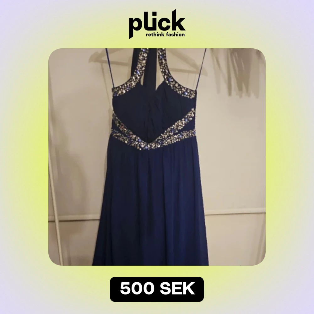 Djupblå, lyxig klänning för fest eller bal. Resår i ryggen gör den bekräm och passar både större och mindre storlekar