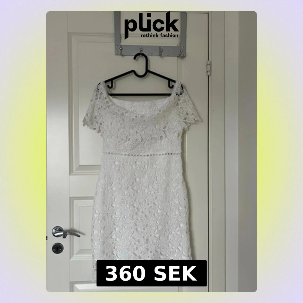 Kort vit klänning med vackert blommigt spetsmönster och offshoulder-design. Klänningen har korta ärmar och en feminin, figurnära passform. Perfekt för sommarens alla tillfällen där du vill känna dig extra fin.