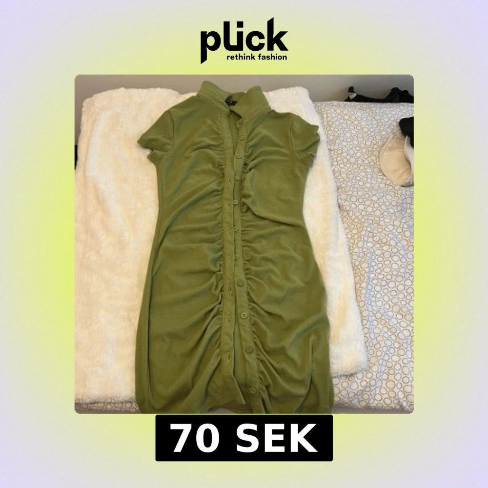 Snygg grön kortklänning från SHEIN med korta ärmar och hög krage. Klänningen har knappar hela vägen framtill och cool rynkdetalj längs knappraden. Tillverkad i mjukt, stretchigt material som känns bekvämt mot huden.