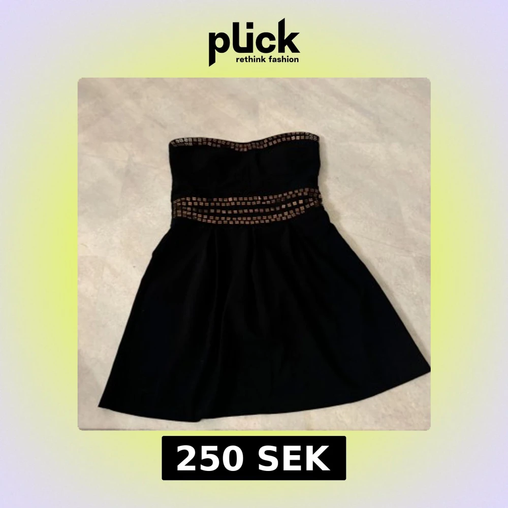 Snygg svart axelbandslös klänning med dekorativa rutmönstrade detaljer i bronsfärg runt byst och midja. Perfekt för en elegant kvällslook.