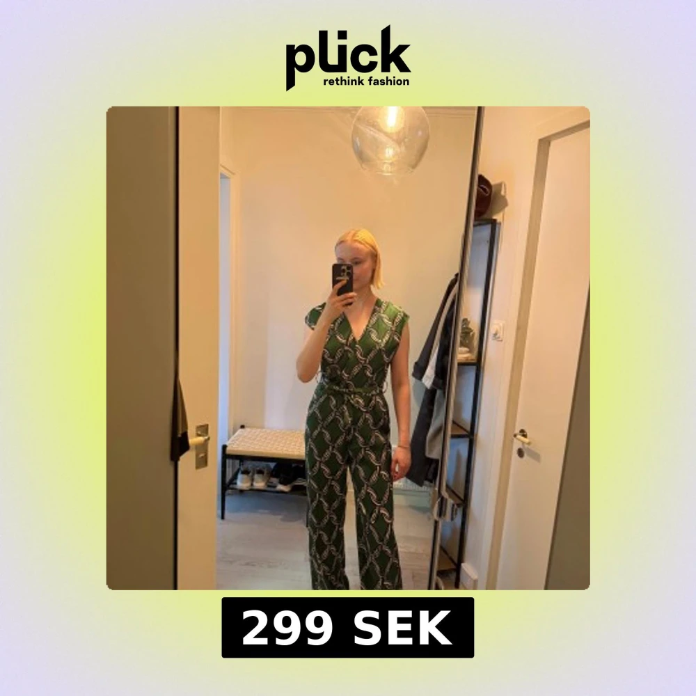 Snygg byxdress från MNG i grönt med grafiskt mönster i vitt och svart. Byxdressen har markerad midja, fickor och är tillverkad i ett mjukt, satinliknande tyg.