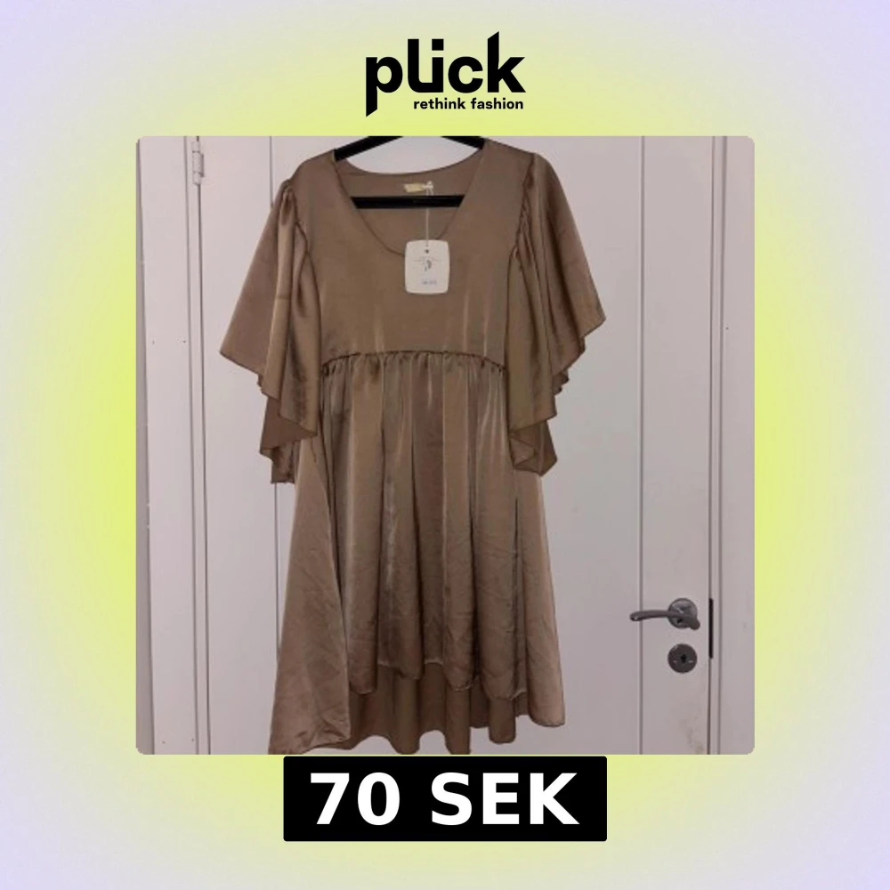 Snygg beige klänning med v-ringning och volangärmar. Klänningen har omlottkänsla och ett lätt glansigt material som ger en lyxig look. Perfekt för dig som vill sticka ut med en elegant och trendig stil. Prislapp kvar