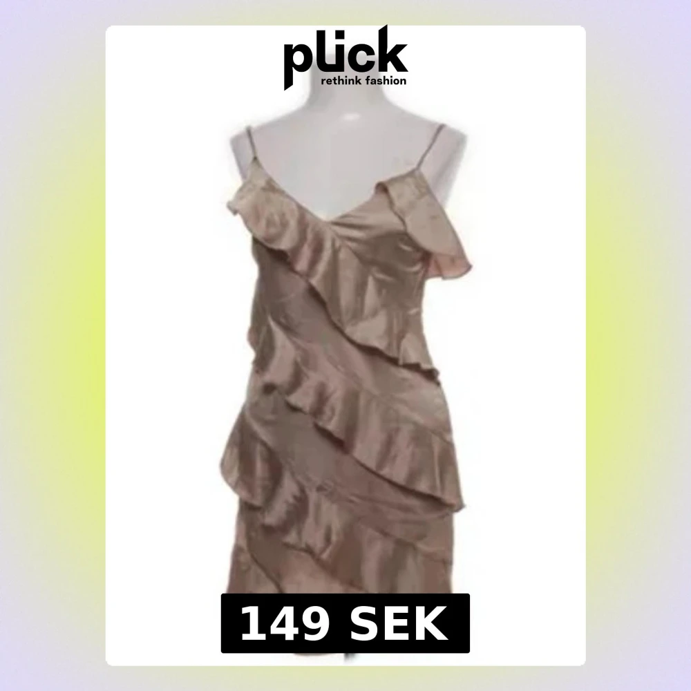Snygg kort klänning i champagnefärg från bohoo med tunna axelband och flera volanglager. Klänningen har en omlottliknande design upptill och är tillverkad i ett glansigt material som ger en lyxig känsla. Perfekt för dig som vill sticka ut. Aldrig använd
