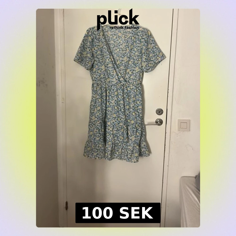 Söt kort omlottklänning från Pigalle med blommigt mönster i blått, vitt och gult. Klänningen har volangkant nedtill, v-ringning och korta ärmar. Perfekt för sommarens alla tillfällen. Materialet är mjukt och lätt bomull. Pris kan diskuteras, tvätt ingår innan leverans ❤️ frågor kan ställas