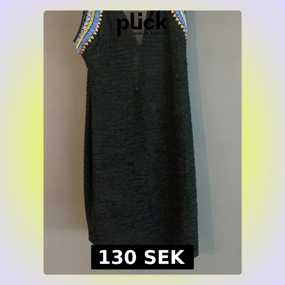 Snygg svart klänning med v-ringning och pärlbroderade axelband i blått, guld och vitt. Klänningen har en rak passform och är ärmlös, vilket ger en stilren och modern look. Perfekt för dig som vill sticka ut med detaljerade axlar.