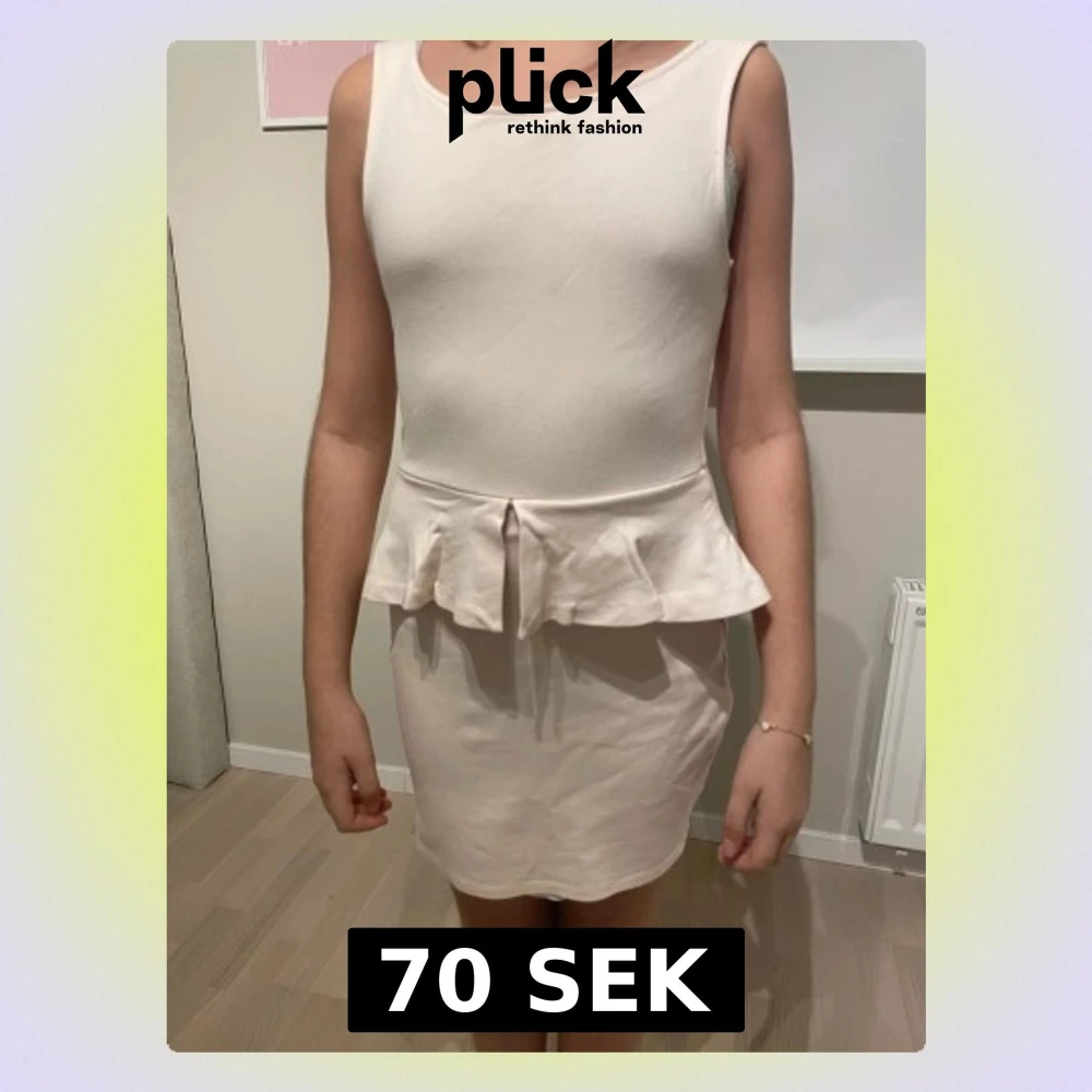 Snygg vit kortklänning från Zara Trafaluc med peplumdetalj i midjan och djup, öppen rygg. Klänningen är ärmlös och har en rundad halsringning framtill. Materialet känns mjukt och stretchigt, perfekt för dig som gillar stilrena och feminina plagg.
