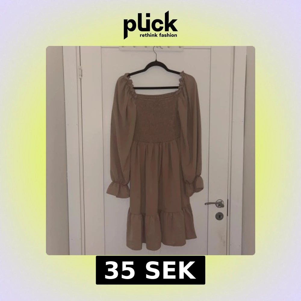 Söt beige klänning med långa puffärmar och volangdetaljer nertill. Smockad överdel och rundad halsringning ger en trendig look. Perfekt för dig som gillar en romantisk och avslappnad stil.