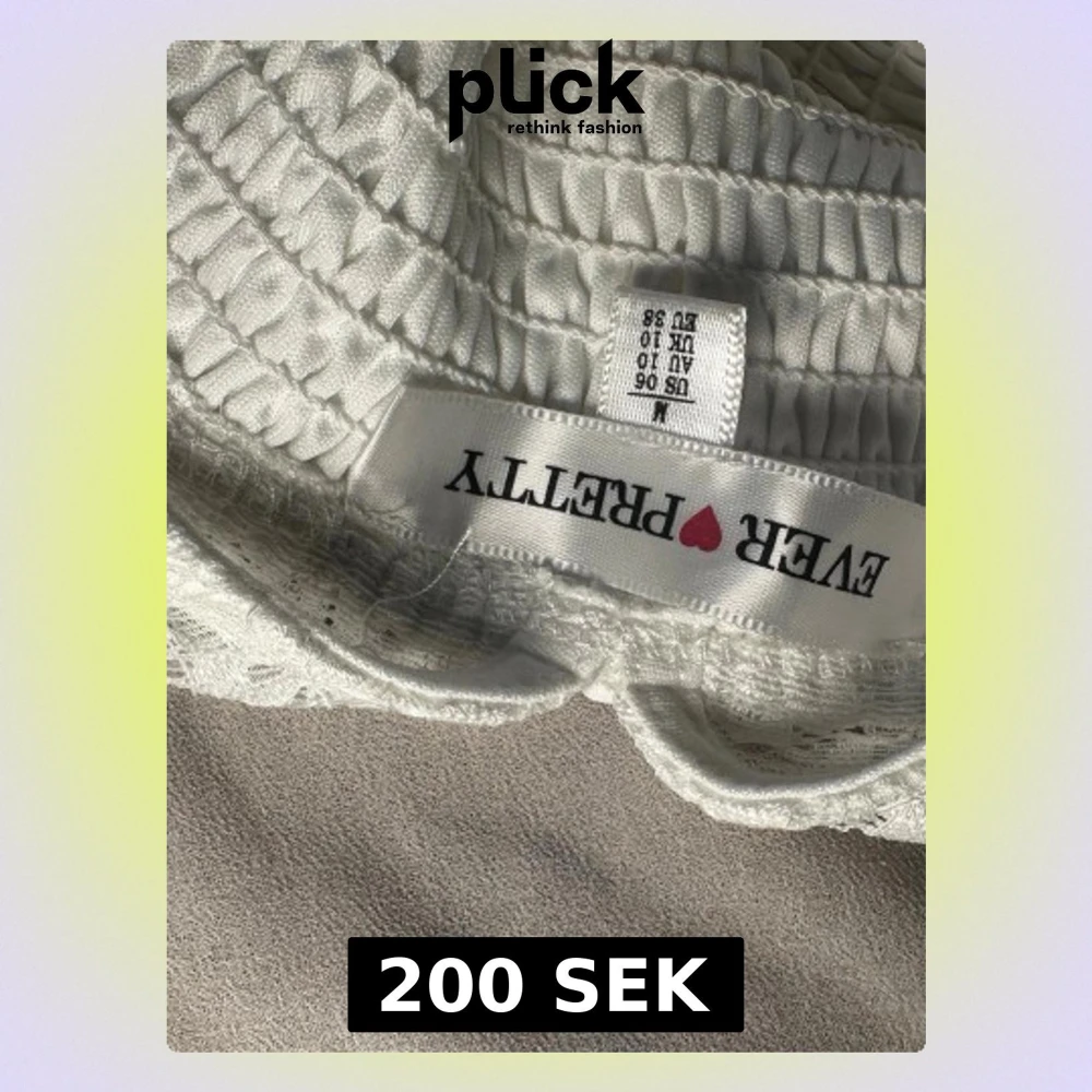 Säljer en vit långklänning från Ever Pretty med spets upptill och korta ärmar. Klänningen har v-ringad rygg, smock i midjan och ett medföljande bälte. Materialet är mjukt och lätt, med spetsdetaljer som ger en romantisk känsla.