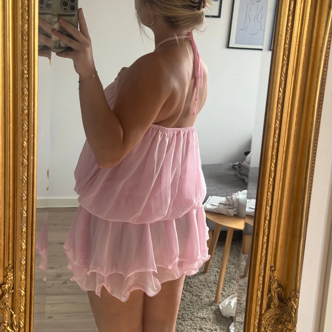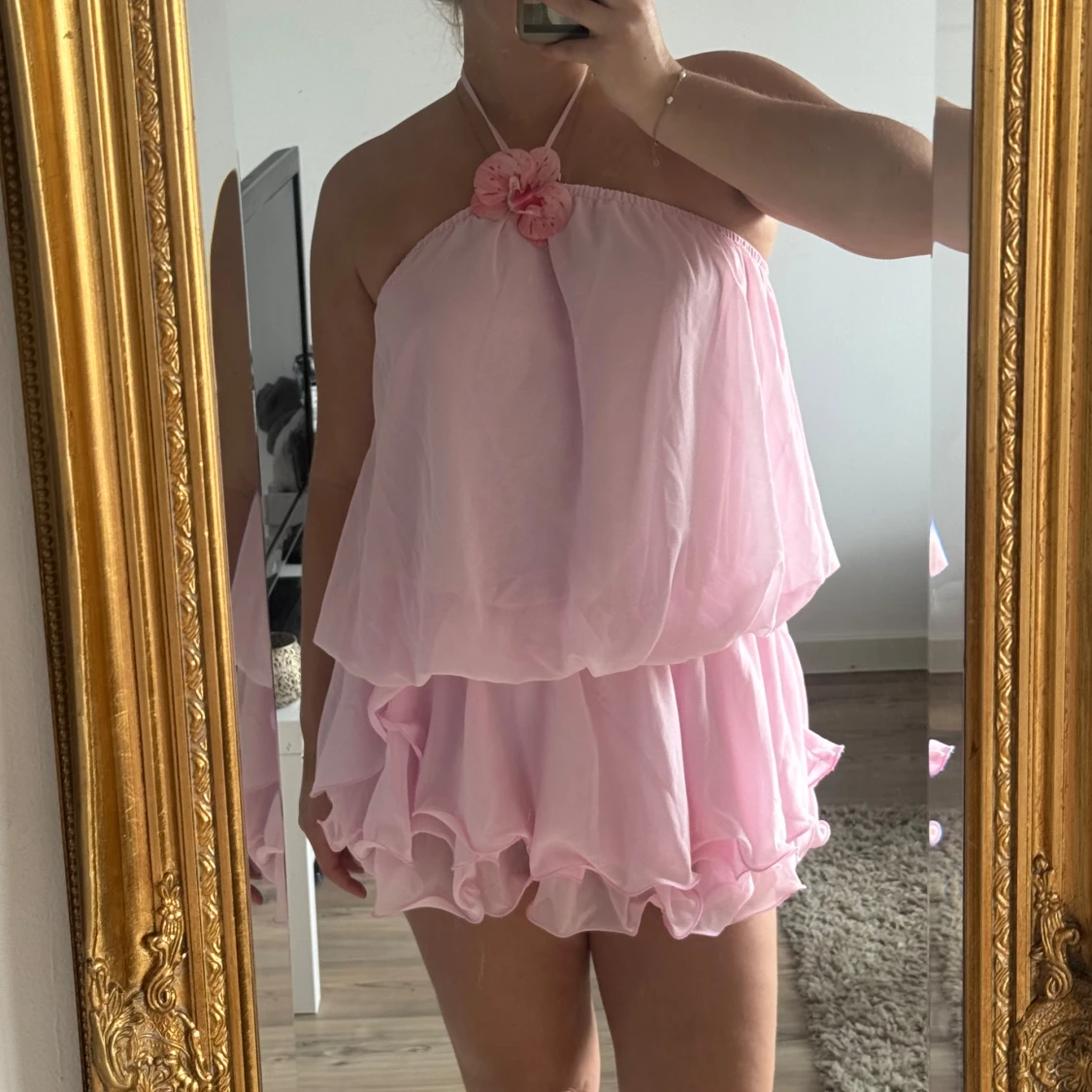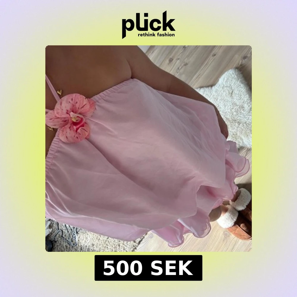 Supersöt kort rosa klänning med volanger och halterneck. Klänningen har en stor dekorativ blomma vid halsen och är tillverkad i ett lätt, transparent material som ger en fluffig och luftig känsla. Perfekt för dig som vill sticka ut med en lekfull och feminin look.