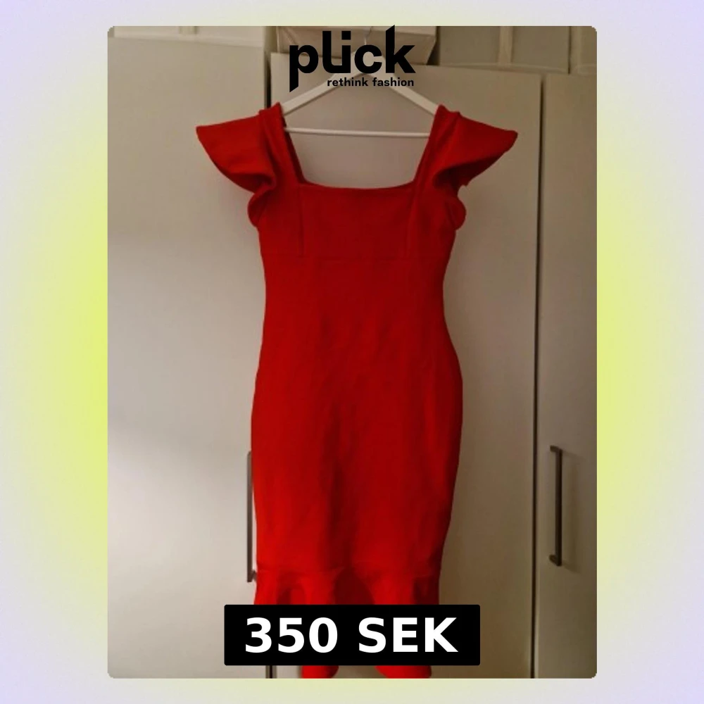Snygg röd klänning med figurnära passform, fyrkantig urringning och stora statementärmar. Klänningen har volangdetalj nertill och dragkedja i ryggen. Perfekt för dig som vill sticka ut med en färgstark look.