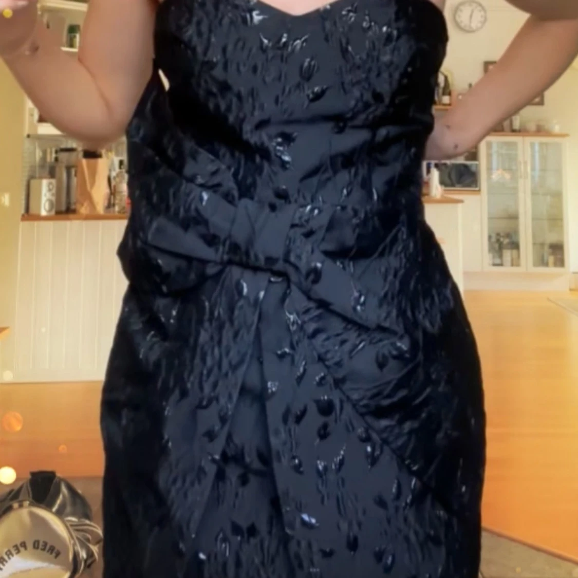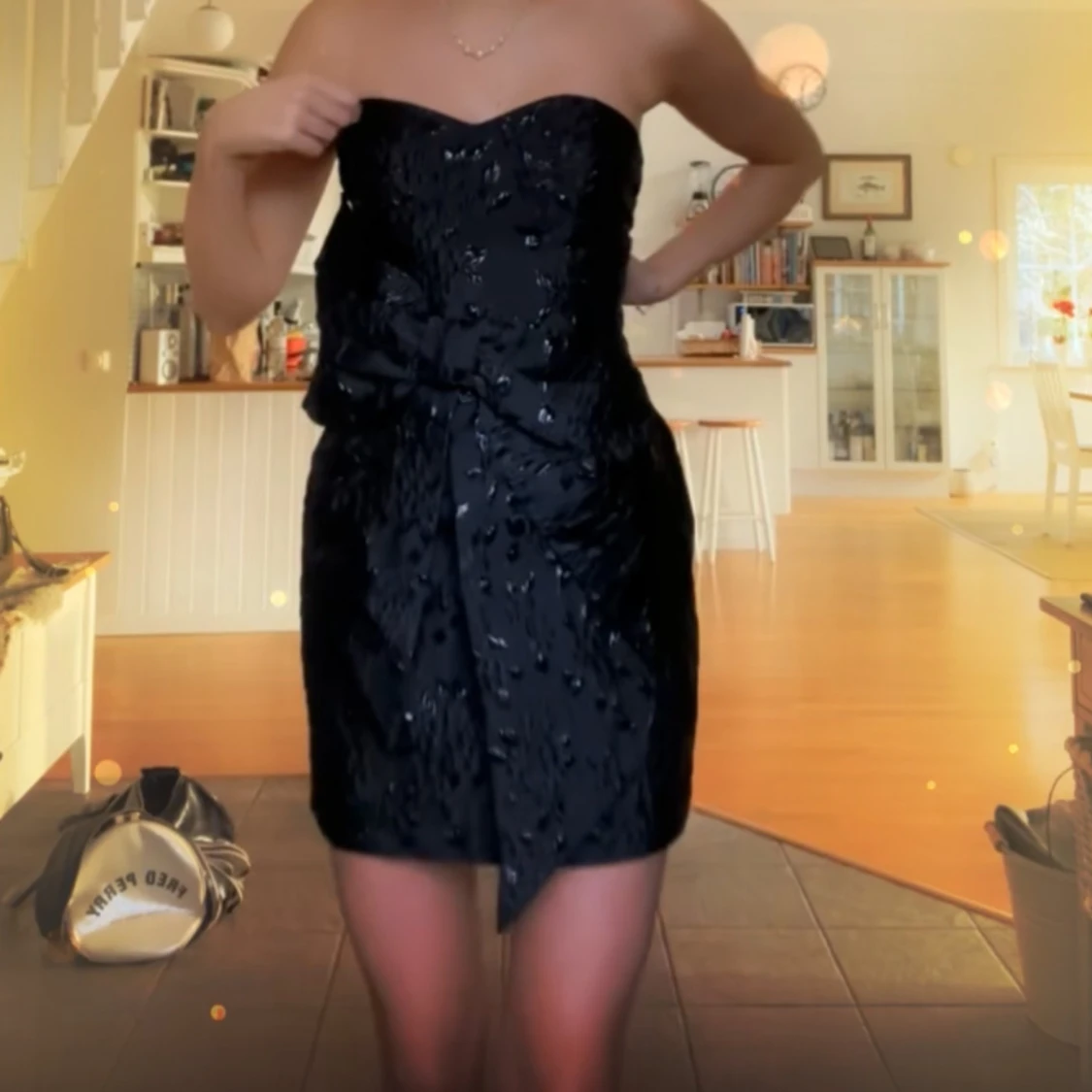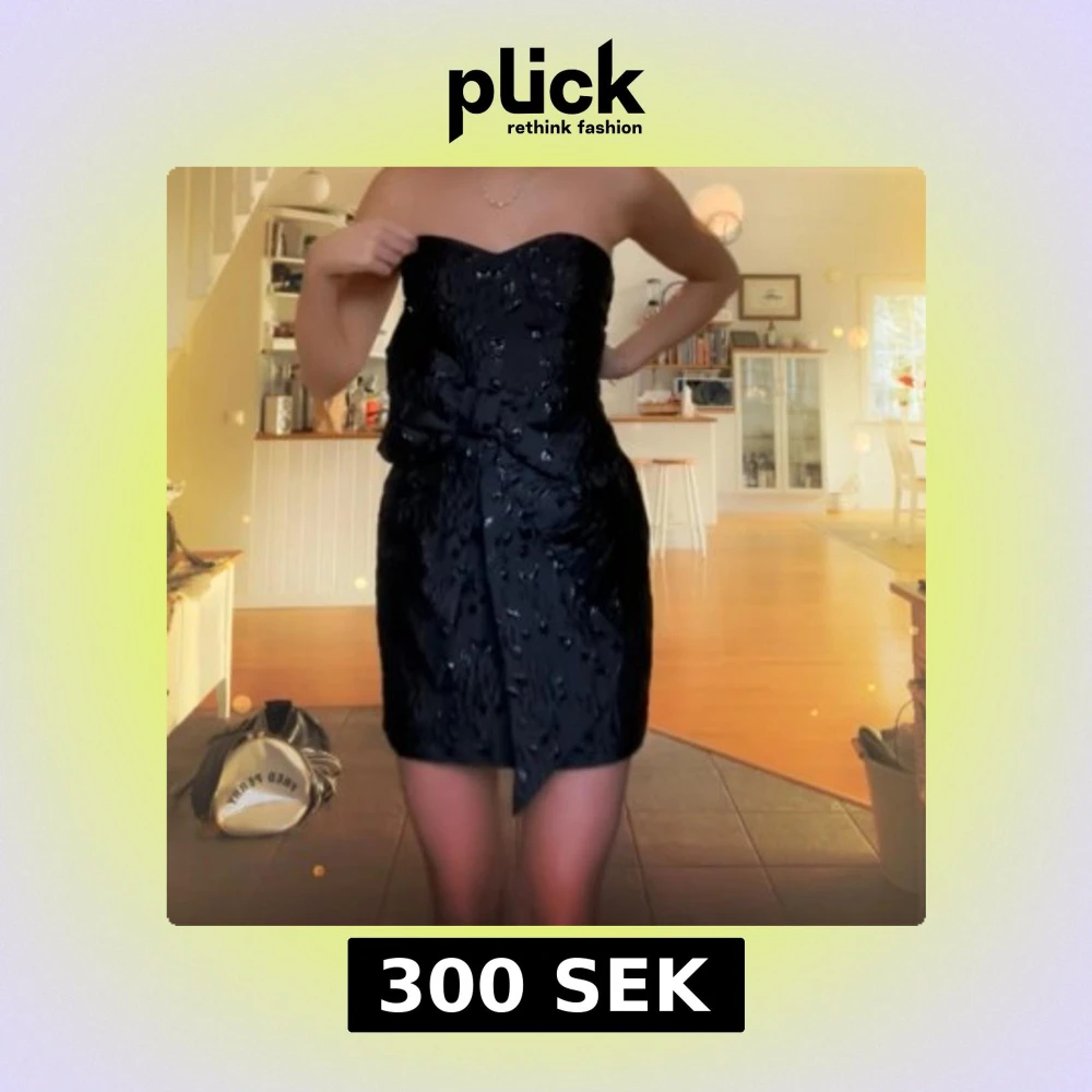 Säljer en svart axelbandslös kortklänning med glansig struktur och dekorativ rosett i midjan. Klänningen har en elegant och figurnära passform, perfekt för festliga tillfällen.
