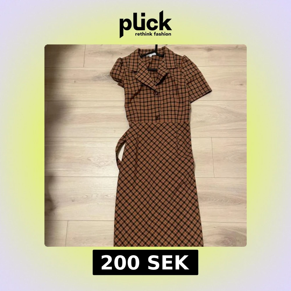 Snygg rutig klänning i brunt och svart med korta ärmar och knappar framtill. Den har en klassisk krage och ett matchande bälte i midjan för en fin silhuett. Perfekt för en stilren look!