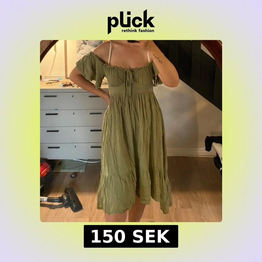 Supersöt grön klänning med offshoulder och volangärmar. Smockad rygg, knytning fram och flowig kjol i midi-längd. Perfekt för varma dagar och har en avslappnad, bohemisk vibe. Gjord i ett lätt och luftigt material. Använd en gång.