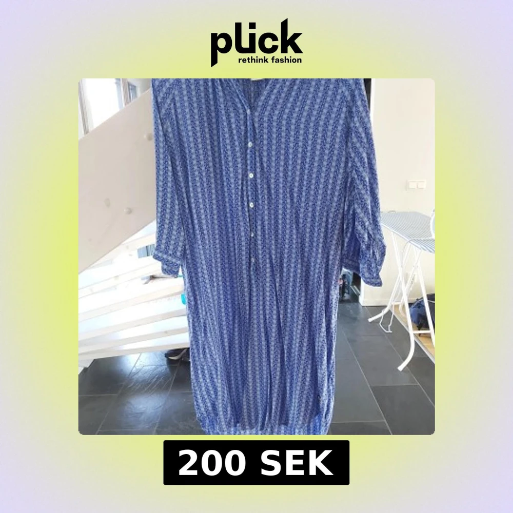 Säljer en blå långklänning med ett snyggt blåmusslor mönster och knappar framtill. Klänningen har trekvartsärm och är tillverkad i ett mjuk viskos som känns skönt mot huden. Perfekt för dig som gillar avslappnad stil med lite extra färg.