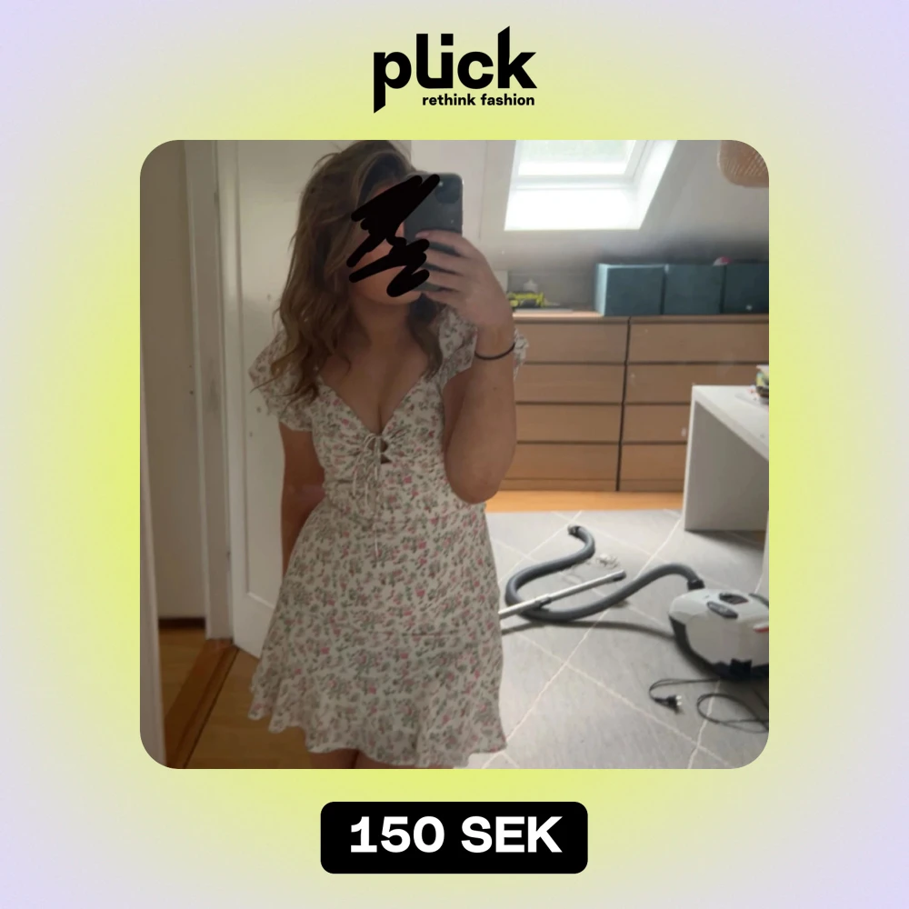 Söt blommig klänning i vitt med rosa och gröna blommor. Den har en v-ringad design med knyt framtill och korta puffärmar. Perfekt för sommarens alla tillfällen!