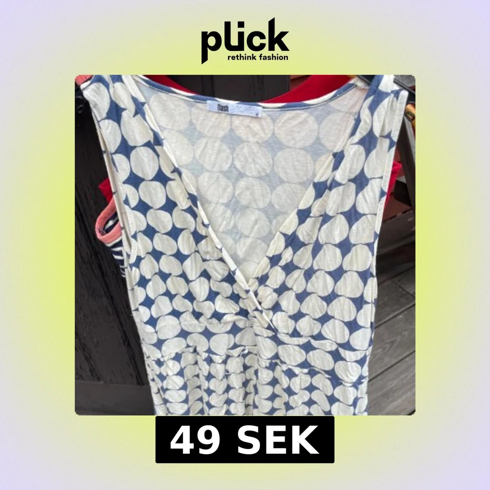 Flash ärmlös omlottklänning i blått och vitt med stort prickigt mönster. Omlottmodell med v-ringning och mjukt, lätt material som känns skönt mot huden. Perfekt för varma dagar när du vill ha något luftigt och snyggt.