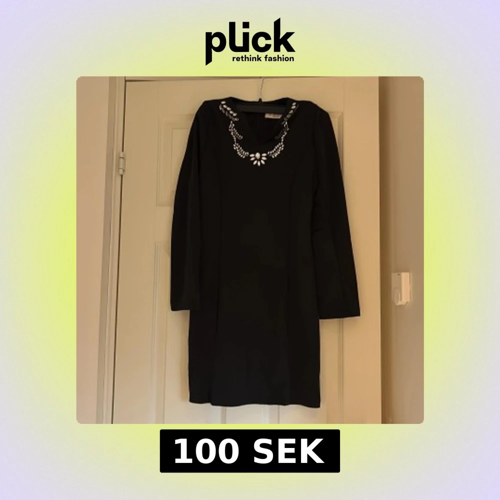 Svart kortklänning från Heramay med långa ärmar och snygga glittriga stenar runt halsringningen. Klänningen har en rak passform och dragkedja i ryggen. Perfekt för dig som vill sticka ut med en elegant och stilren look.