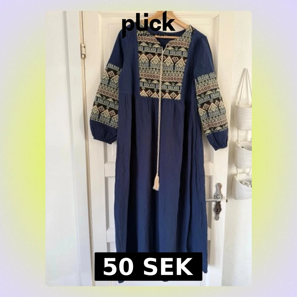 Marinblå långklänning från SHEIN med broderade detaljer i vitt och vinrött på bröst och ärmar. Klänningen har lång ärm, lös passform och dekorativ snörning framtill. Perfekt för dig som gillar boho-vibbar och unika mönster.