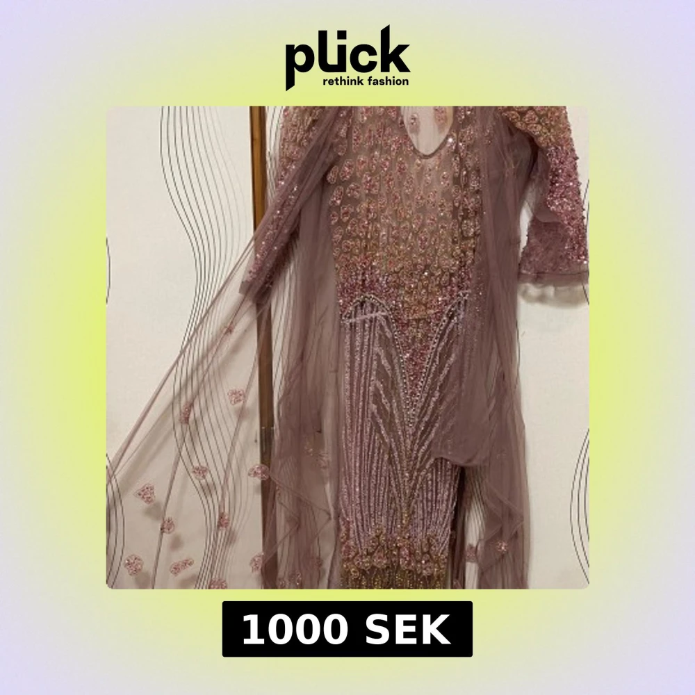 Elegant rosa klänning med glittriga detaljer och pärlor. Den har en v-ringad design och långa ärmar. Klänningen är dekorerad med ett transparent lager som ger en extra dimension. Köpt för 2000 och är en festlig klänning